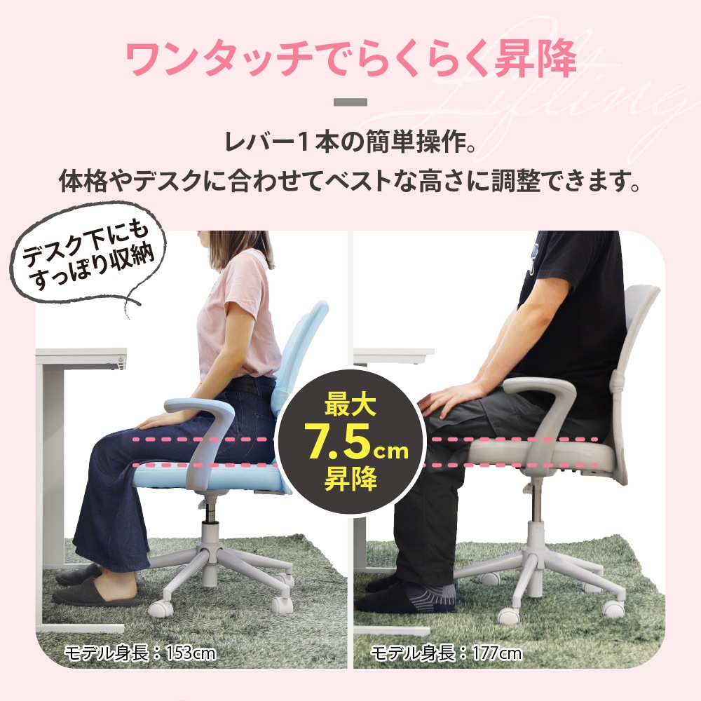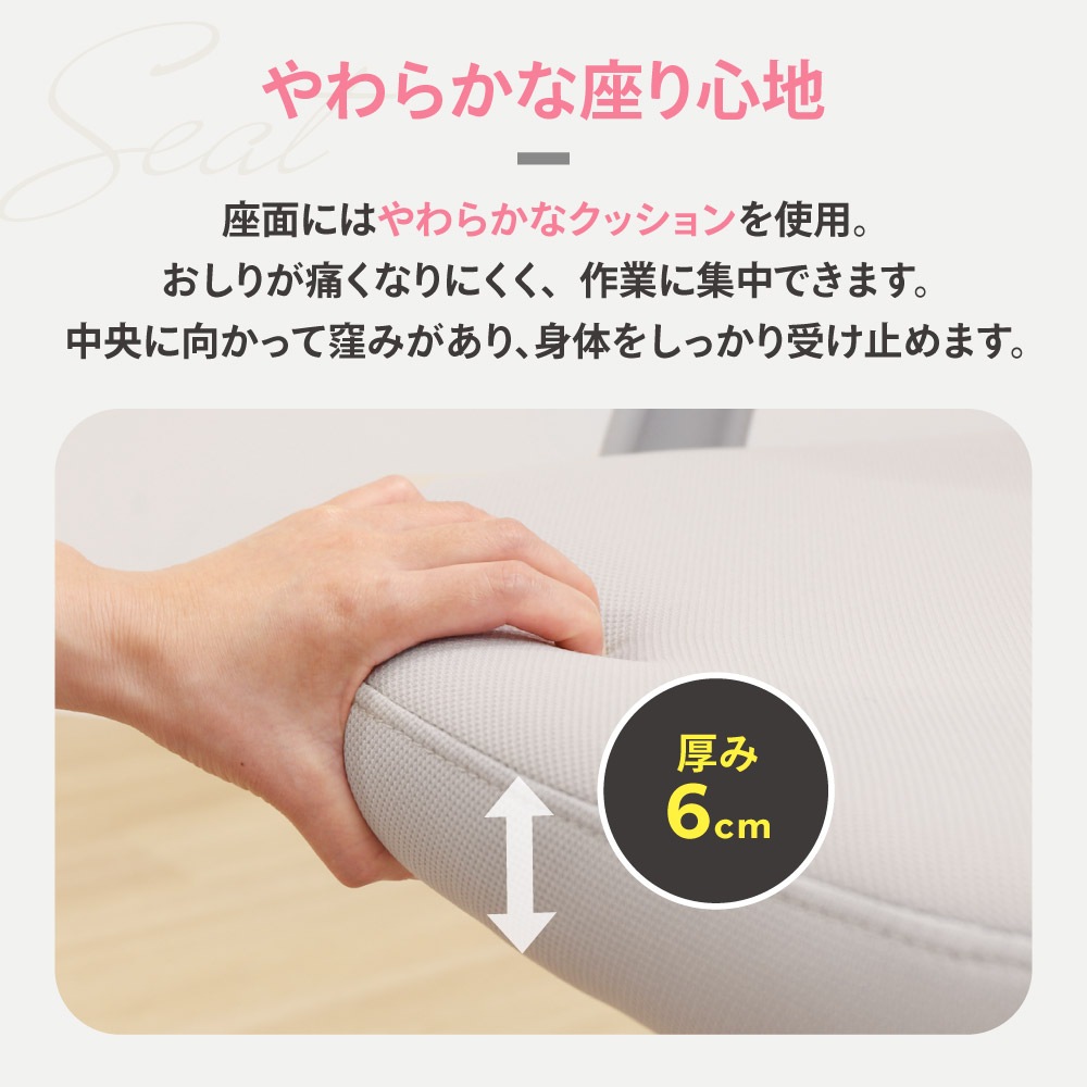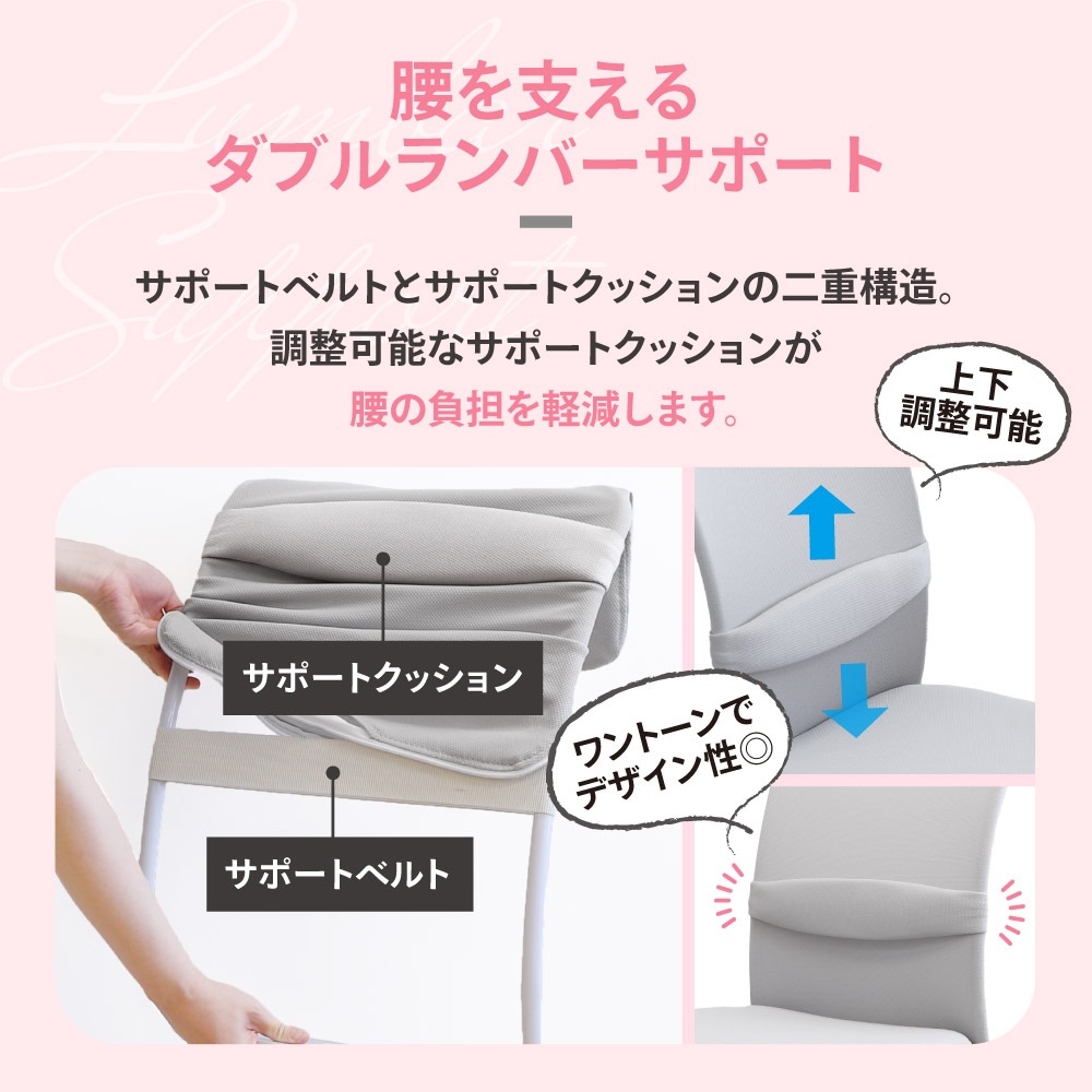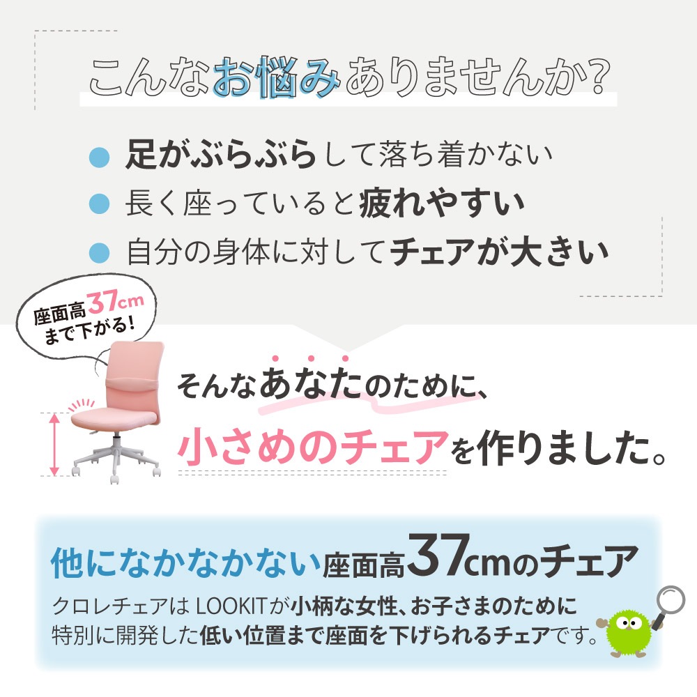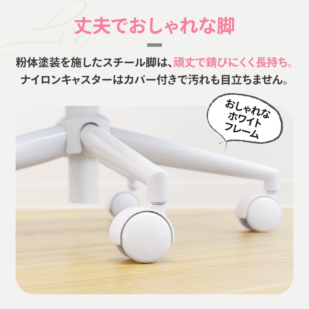 最小座面高370mmの低め設計。お子さまや小柄な女性が座りやすいコンパクトチェアです。 背座の素材にはメッシュを使用。年中蒸れず、快適です。 ダブルランバーサポートを採用し、二重構造で腰の負担を軽減。サポートクッションは上下調整可能で、お好みの位置でご使用いただけます。 座面はやわらかなウレタンフォームを使用。お尻をやさしく受け止めます。 上下8cm調整できるワンタッチ昇降機能付き。ガスシリンダーは体重が軽い方もらくらく昇降できるものを採用しました。 脚はスチールに粉体塗装を施し、耐久性が高く長持ち。キャスターも含めホワイトで統一し、丈夫さとデザイン性を兼ね備えています。 軽快なナイロンキャスターはカバー付きで汚れも目立ちません。 |