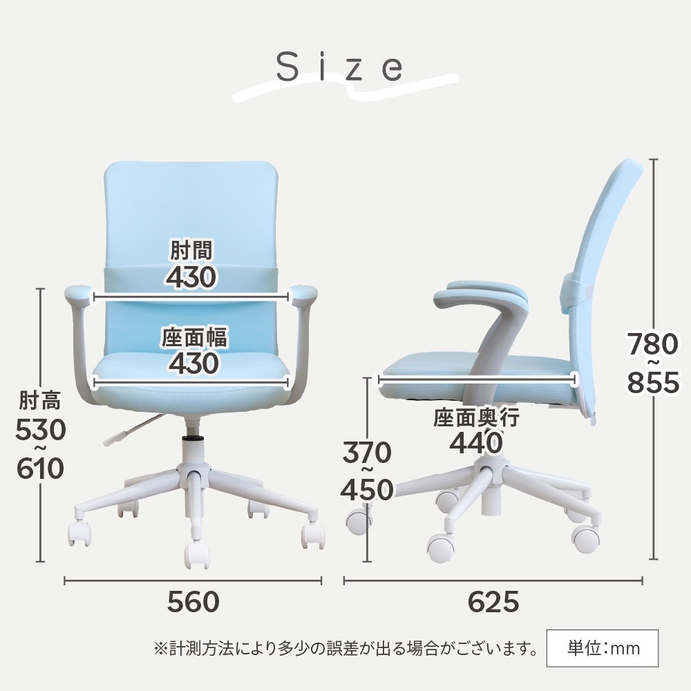 | サイズ | 外寸:幅550×奥行625×高さ780~855(座面高370~450)mm |