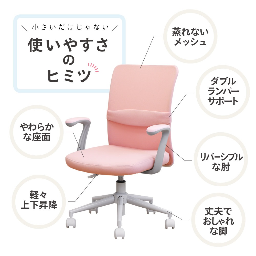 最小座面高370mmの低め設計。お子さまや小柄な女性が座りやすいコンパクトチェアです。 背座の素材にはメッシュを使用。年中蒸れず、快適です。 ダブルランバーサポートを採用し、二重構造で腰の負担を軽減。サポートクッションは上下調整可能で、お好みの位置でご使用いただけます。 座面はやわらかなウレタンフォームを使用。お尻をやさしく受け止めます。 前後どちらでも取り付けられる肘を採用し、お好みでご使用いただけます。 上下8cm調整できるワンタッチ昇降機能付き。ガスシリンダーは体重が軽い方もらくらく昇降できるものを採用しました。 脚はスチールに粉体塗装を施し、耐久性が高く長持ち。キャスターも含めホワイトで統一し、丈夫さとデザイン性を兼ね備えています。 軽快なナイロンキャスターはカバー付きで汚れも目立ちません。 |