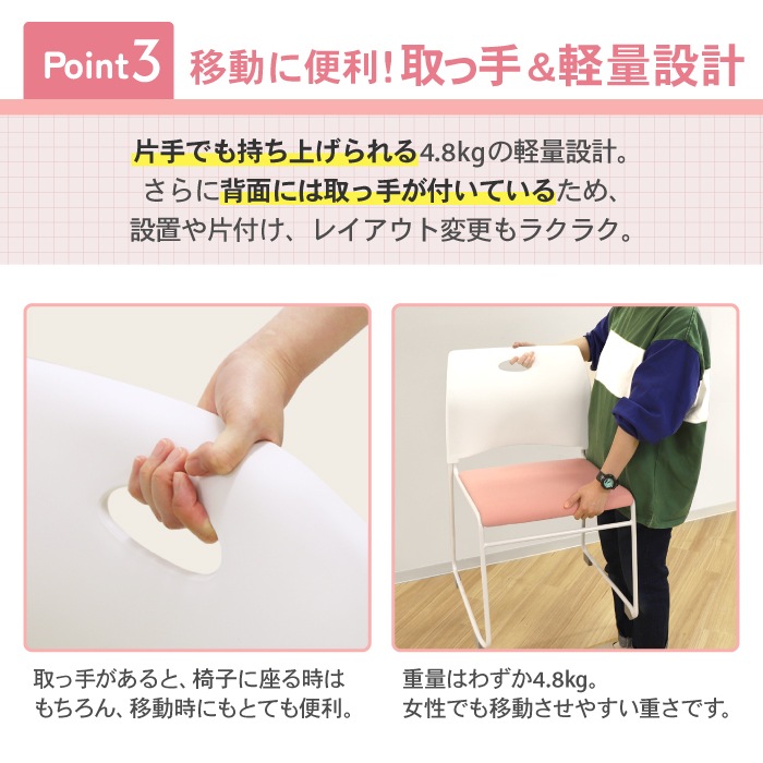 会議室に、休憩室に、セミナールームに。快適な座り心地で会話も弾むRAPチェア! 人間工学に基づく設計の大型背面と、ほどよい弾力と通気性抜群のメッシュ素材を使用したミーティングチェアです。 快適な座り心地だから長時間の会議でも集中力を維持できます。 最大6脚までスタッキングが可能なので、使わない時は重ねてコンパクトに収納が可能。 わずか4.8kgと軽量で、背もたれには取っ手もついているので、設置や片付けもラクラクです。 お届け後すぐにご使用いただける完成品です。 |