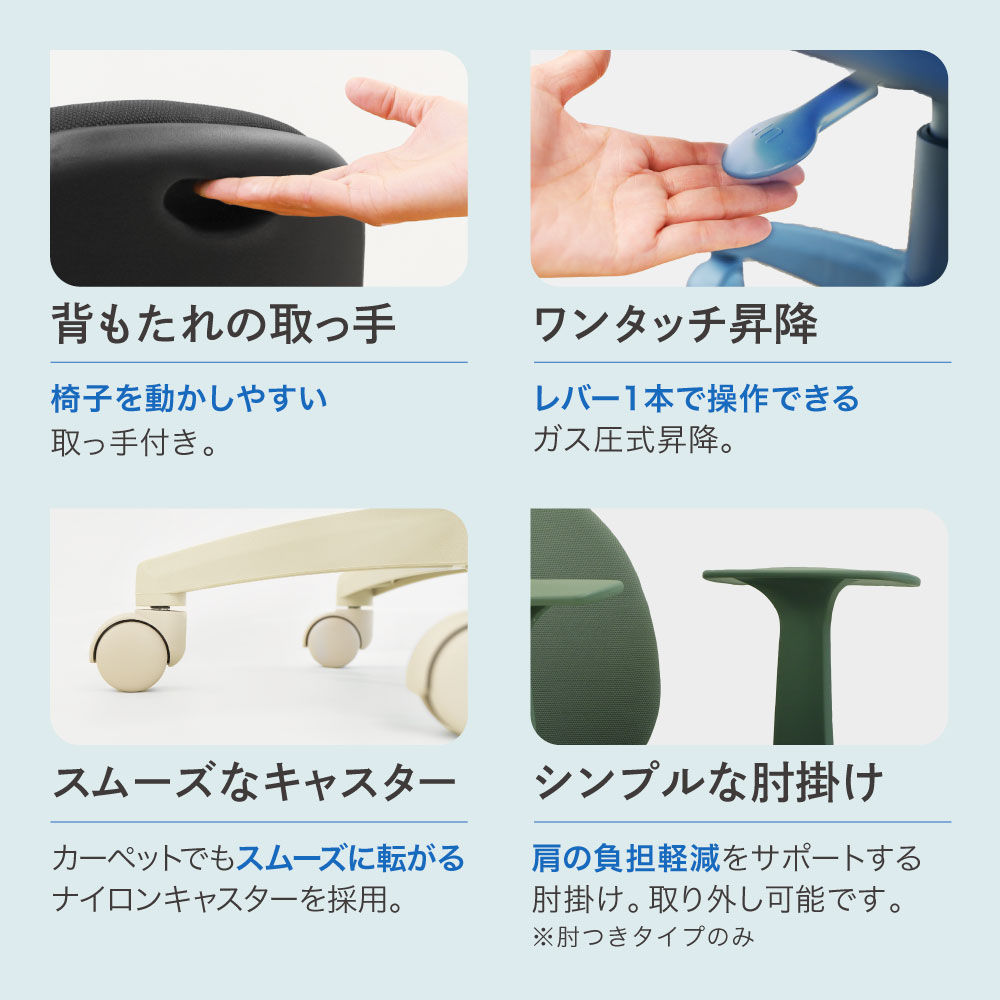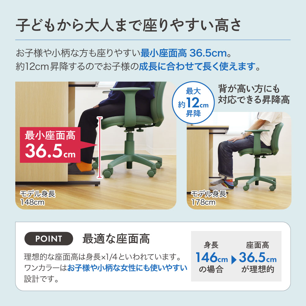 張地からキャスターまでワンカラーにまとめたデザインが印象的なコンパクトチェアです。 最低座面高は36.5cmでお子様や小柄な方も座りやすいサイズ。約12cm昇降するので、お子様の成長に合わせて長く使えて学習椅子におすすめです。 さらりとした肌触りのファブリック生地で蒸れにくく一年中快適。座面や背もたれはお尻や腰にフィットして長時間座っていても疲れにくい形状です。 ころんとしたシンプルなフォルムと、落ち着きのあるニュアンスカラーのワントーンで統一した美しいデザインが、空間に彩りを与えてくれます。 |