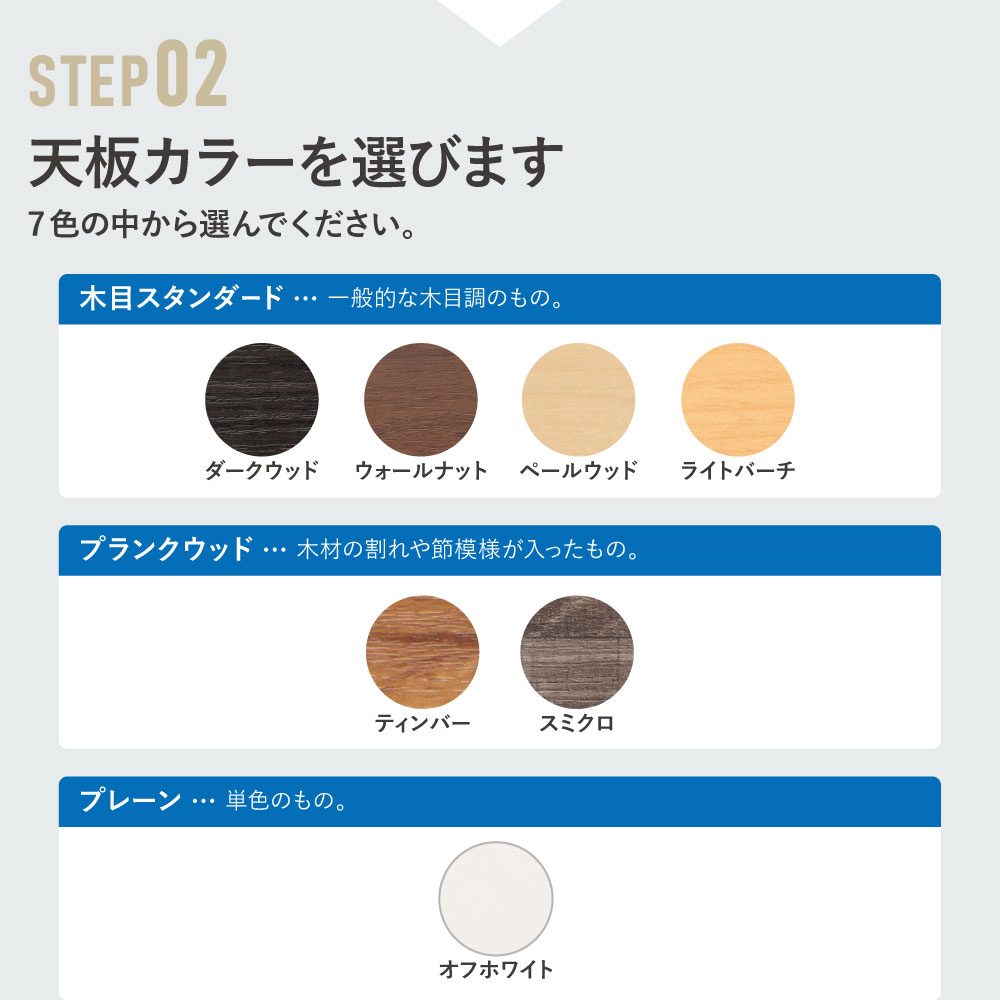 | カラー | 天板:ダークウッド、ウォールナット、ペールウッド、オフホワイト、ティンバー、スミクロ 脚部:シルバー、ブラック、ホワイト |