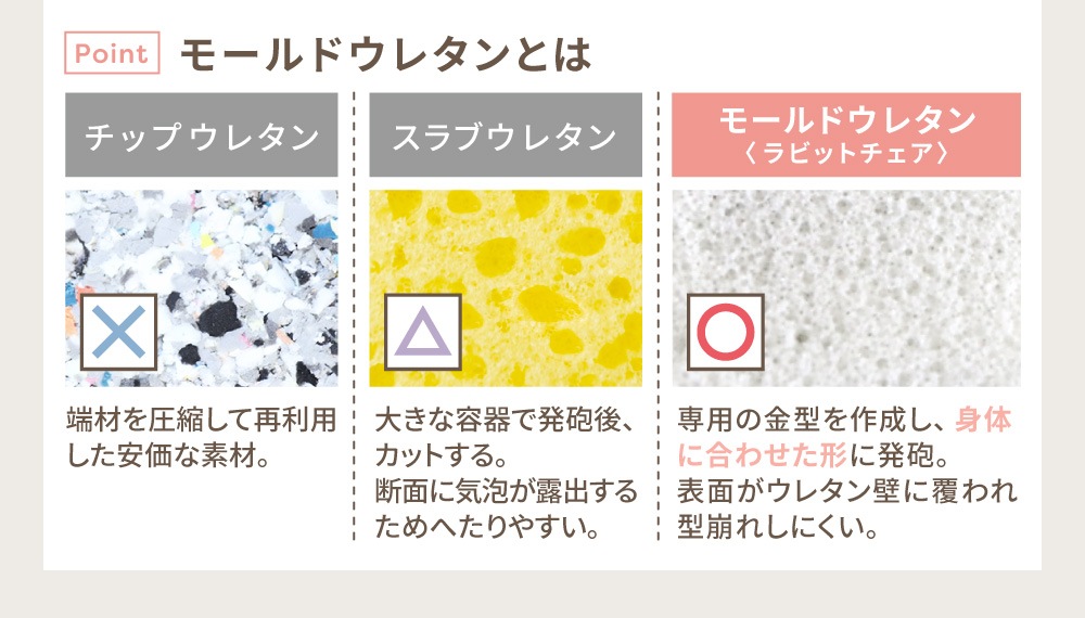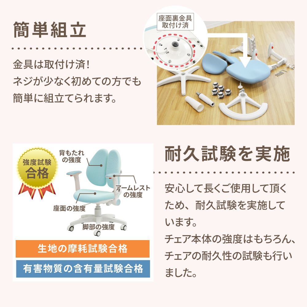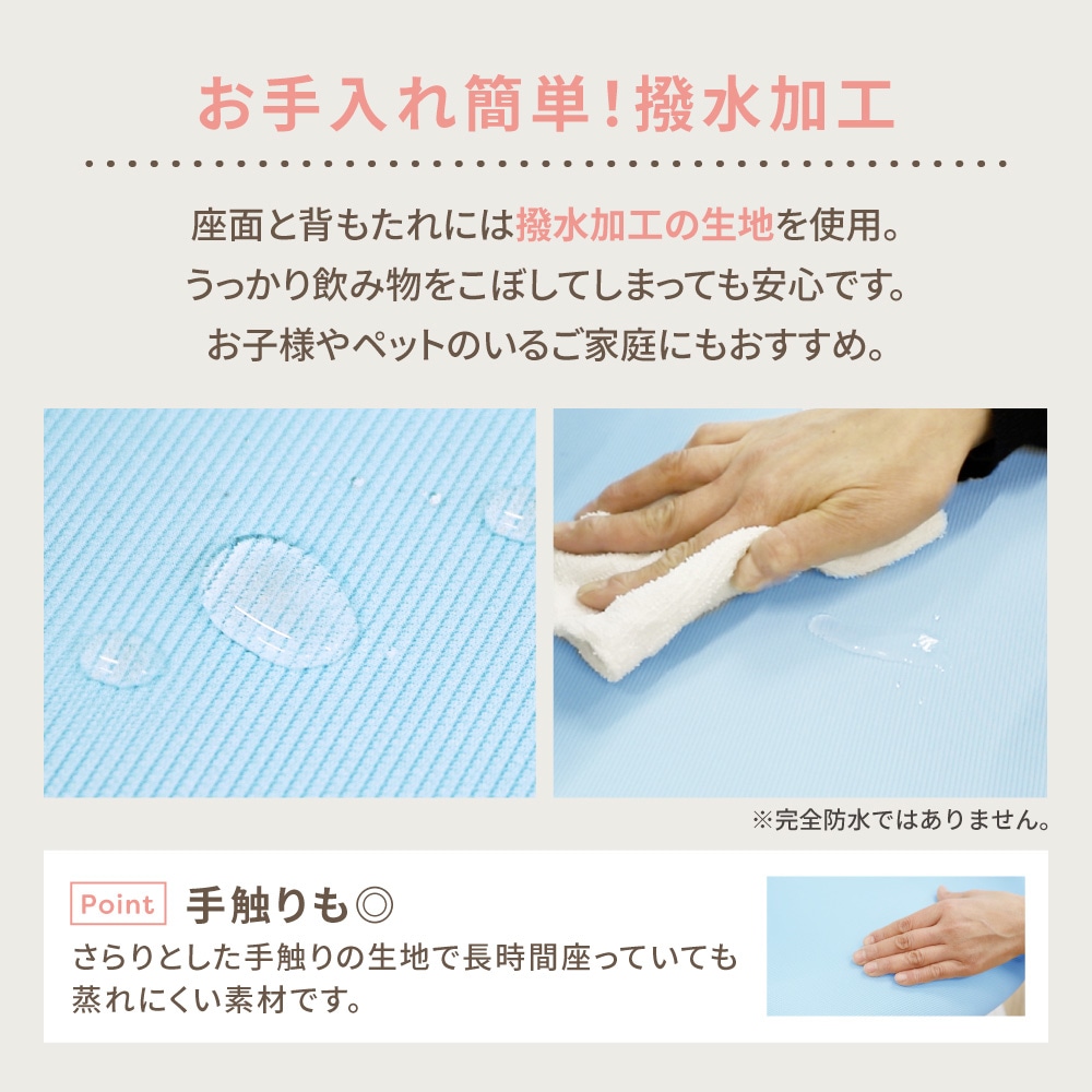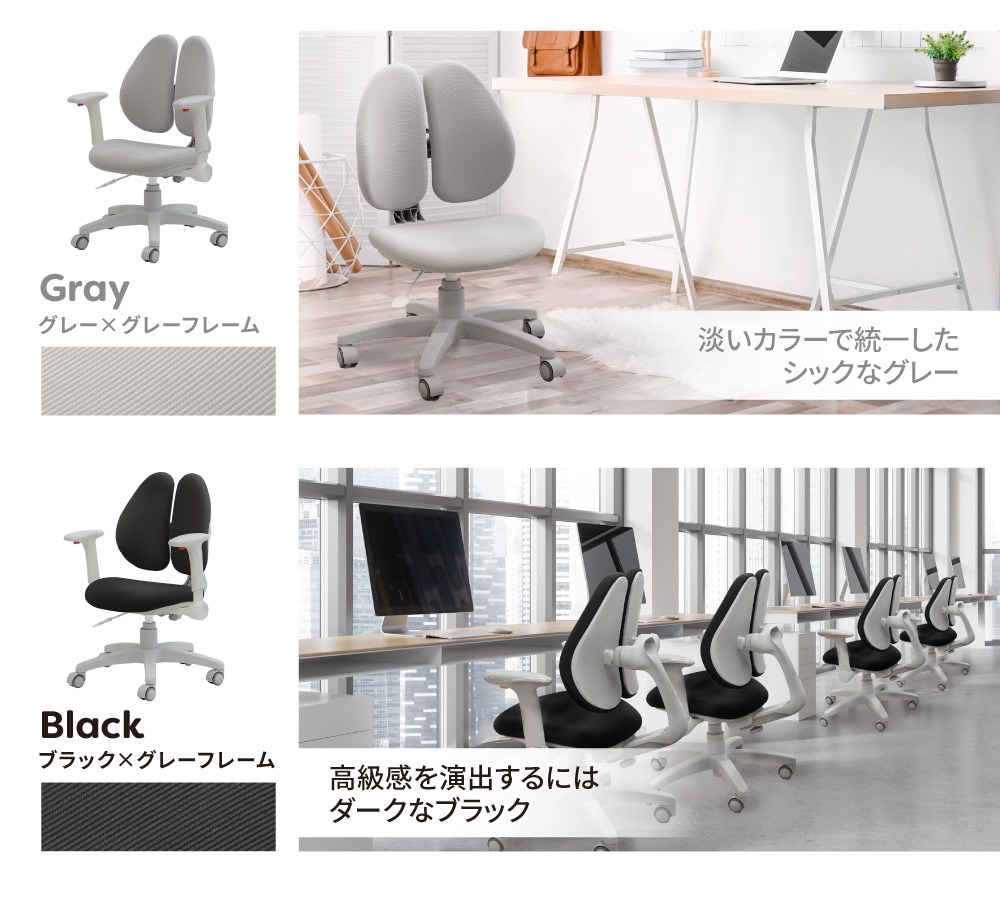 まるでウサギの耳のように2つに分かれた背もたれが、身体にしっかりフィットして負担を軽減。 2つの背もたれが姿勢の動きに追従し、背中にしっかり密着。中央に空間があるため、腰椎を圧迫しません。 さらに背もたれは前後にスライドが可能。背もたれと座面のクッションにはモールドウレタンを使用。また生地は撥水加工を施しているため、飲み物をこぼしてしまっても安心です。 |