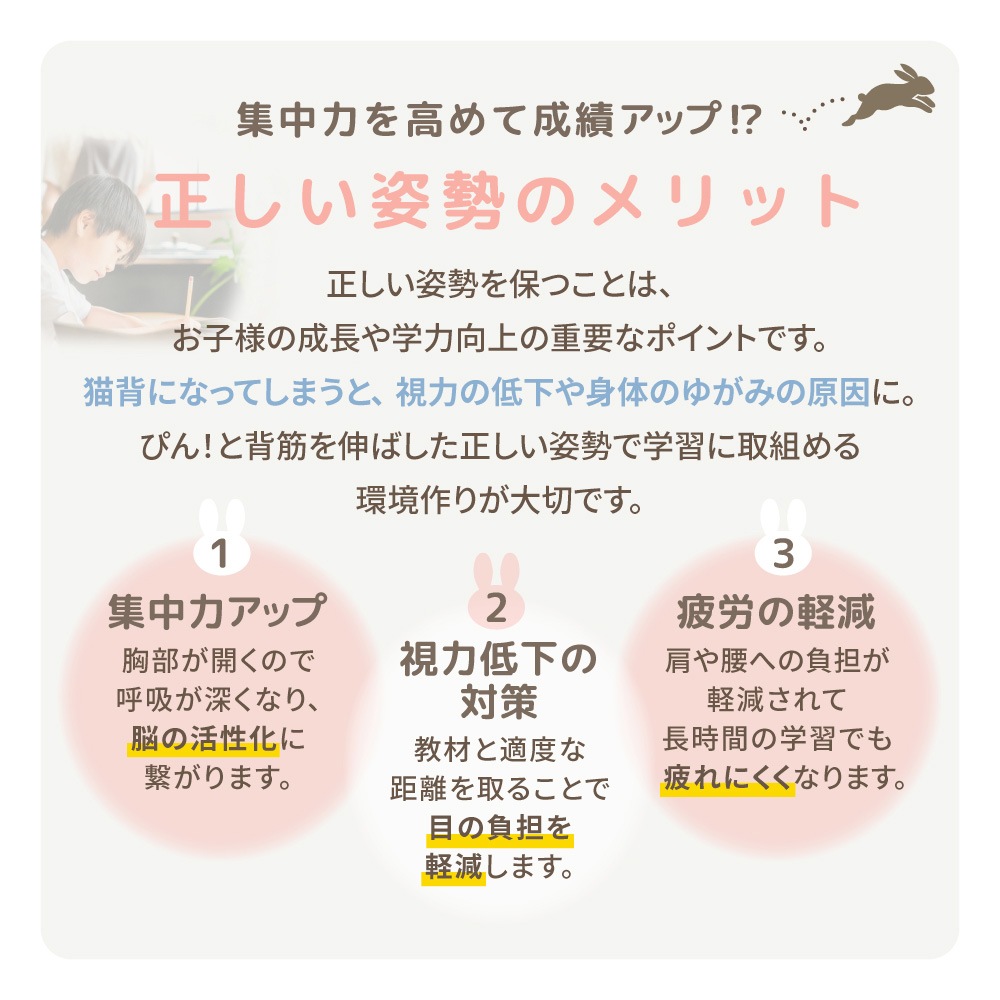 まるでウサギの耳のように2つに分かれた背もたれが、身体にしっかりフィットして正しい姿勢の維持をサポート。 2つの背もたれが姿勢の動きに追従し、背中にしっかり密着。中央に空間があるため、腰椎を圧迫しません。 さらに背もたれは前後にスライドが可能。お子様の成長に合わせて位置を調整することで、正しい姿勢を保ち、しっかりと集中して勉強に取り組めます。 背もたれと座面のクッションにはモールドウレタンを使用。また生地は撥水加工を施しているため、飲み物をこぼしてしまっても安心です。 背の低いお子様には足置きリングを装着すると、足がぶらつかず、正しい姿勢を維持しやすくなります。 |