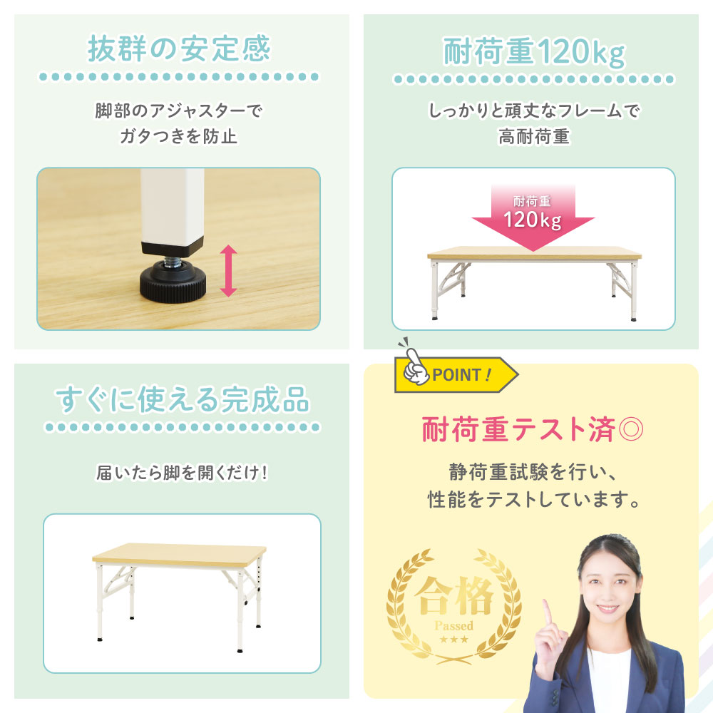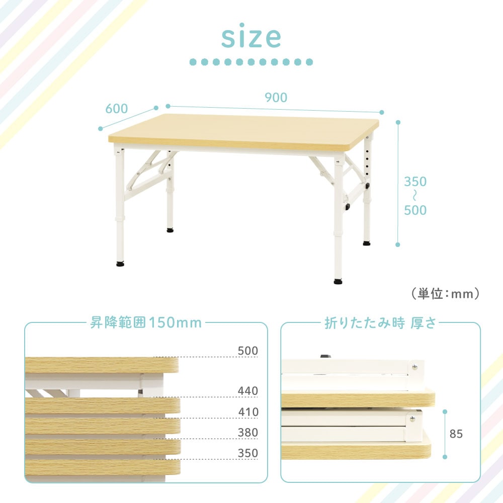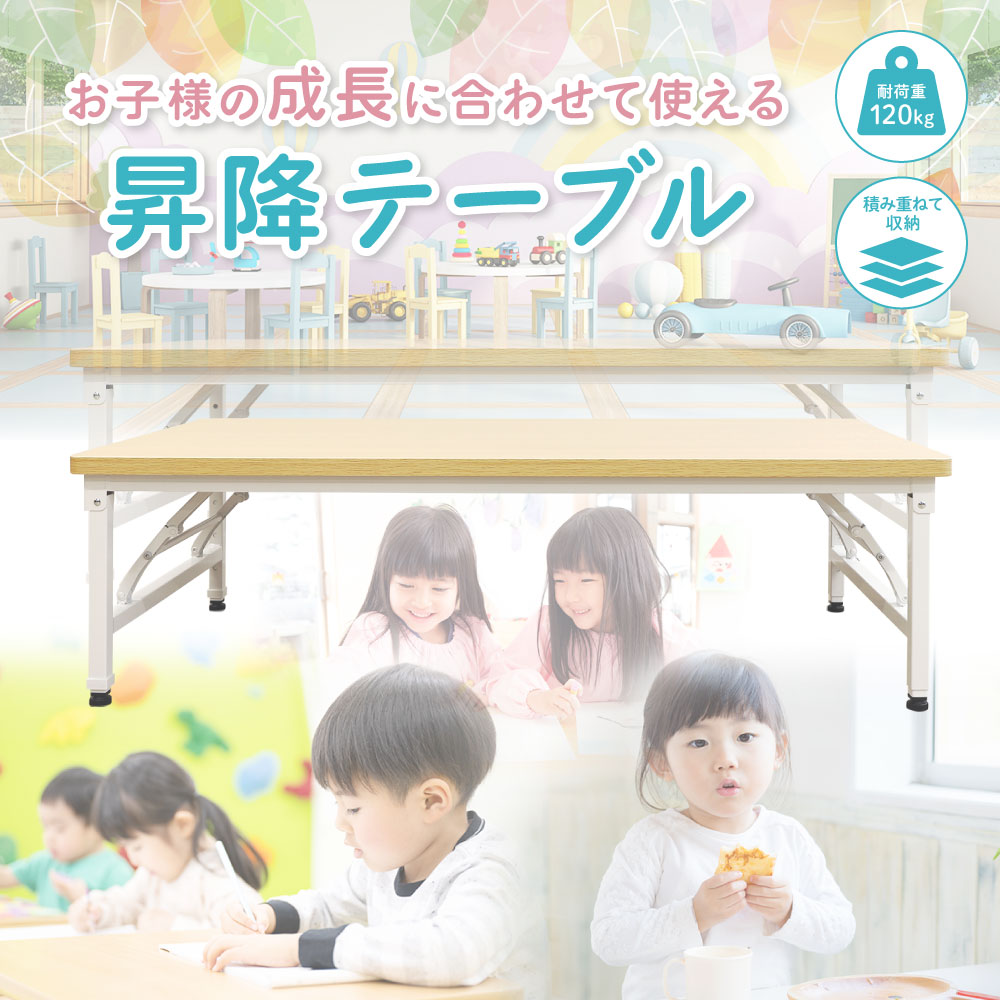 | 高さ調節が可能な折りたたみテーブルなのに耐荷重120kg。 完成品でのお届け&高さ調節は工具不要な簡単設計ですぐにお使いいただけます。 安全な角丸天板仕様で様々な人が使う環境でも安心です。 小さなお子様にも使いやすい高さ350mmから座卓より少し高めな500mmまで昇降するので、保育園やお子様の習い事からご自宅までマルチに活躍します。 |