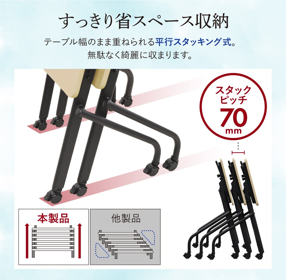 | 平行スタックですっきりコンパクトに収納可能な折りたたみテーブル。 全キャスターにストッパー付きでしっかり固定でき、脚のアジャスターでがたつきも防ぎます。 手荷物をかけておける便利なサイドフック付きです。 |