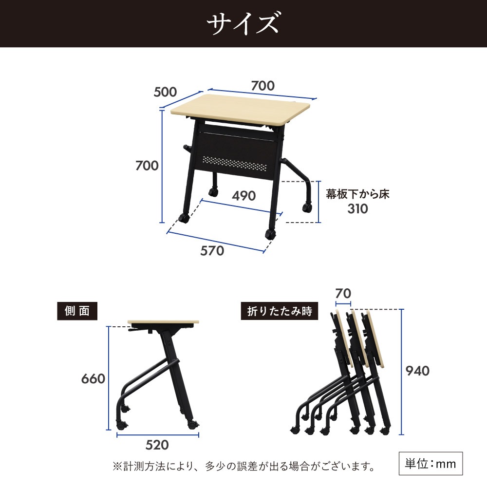 会議用テーブル 幕板付き 幅700×奥行500mm 平行スタッキング ソフトエッジ巻 HST-7050M