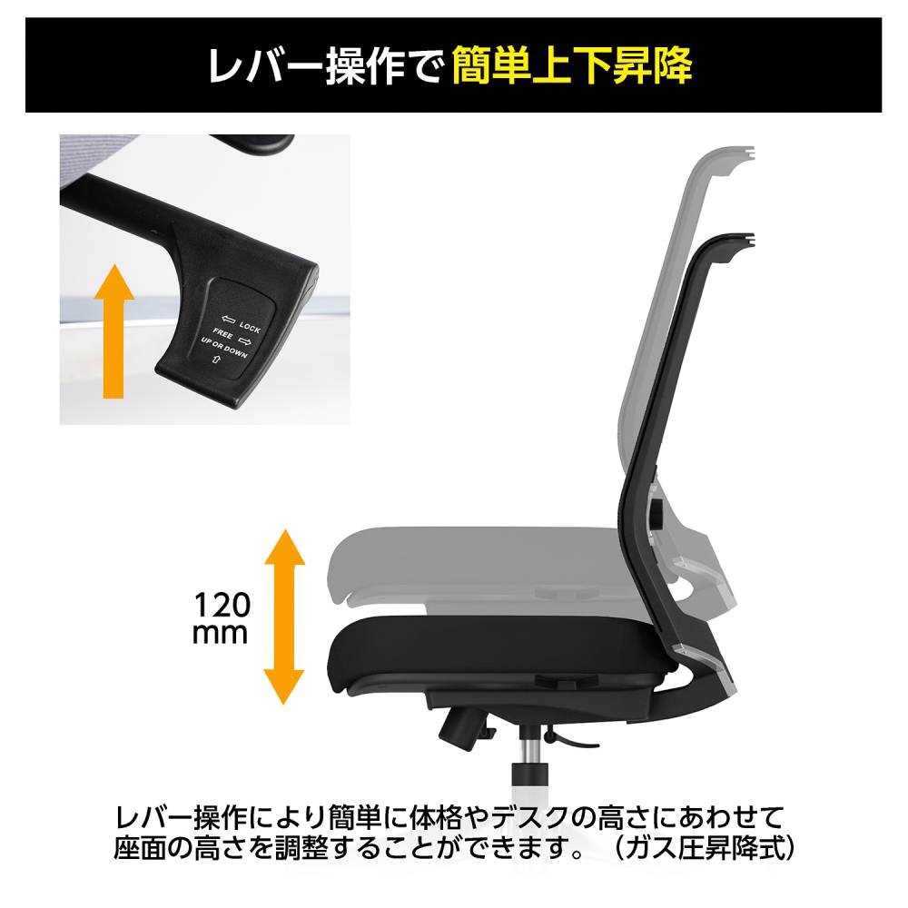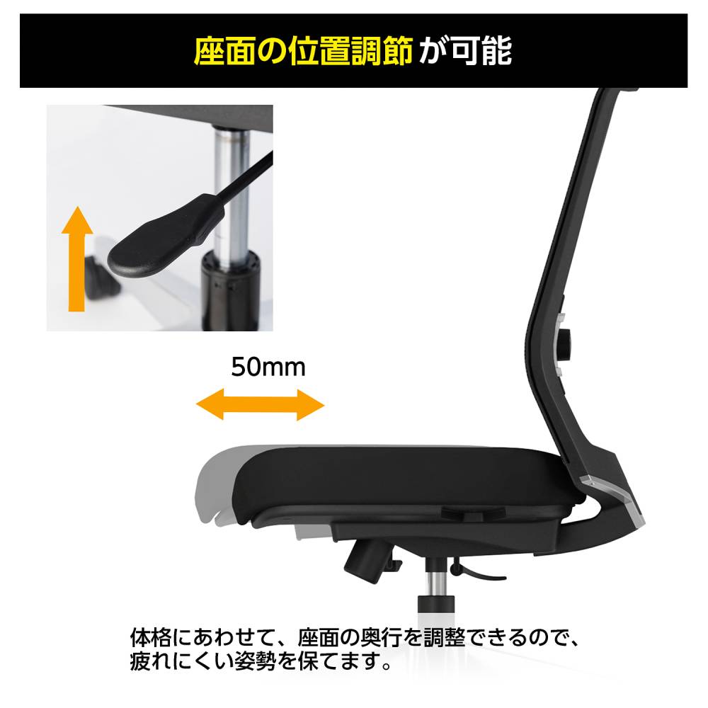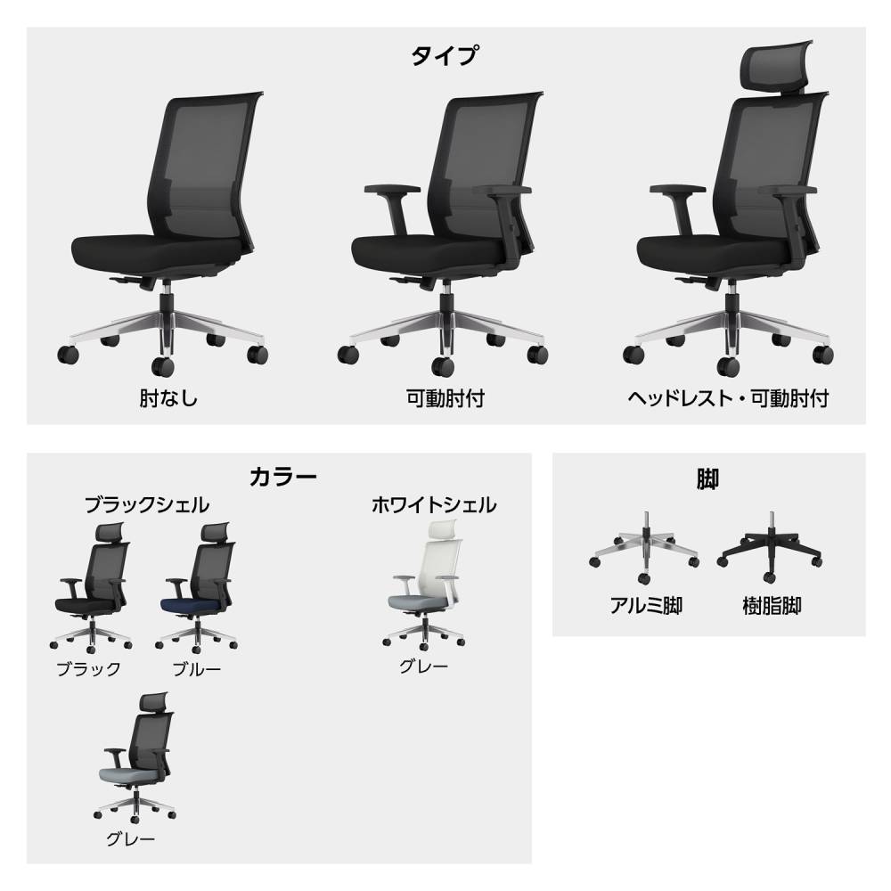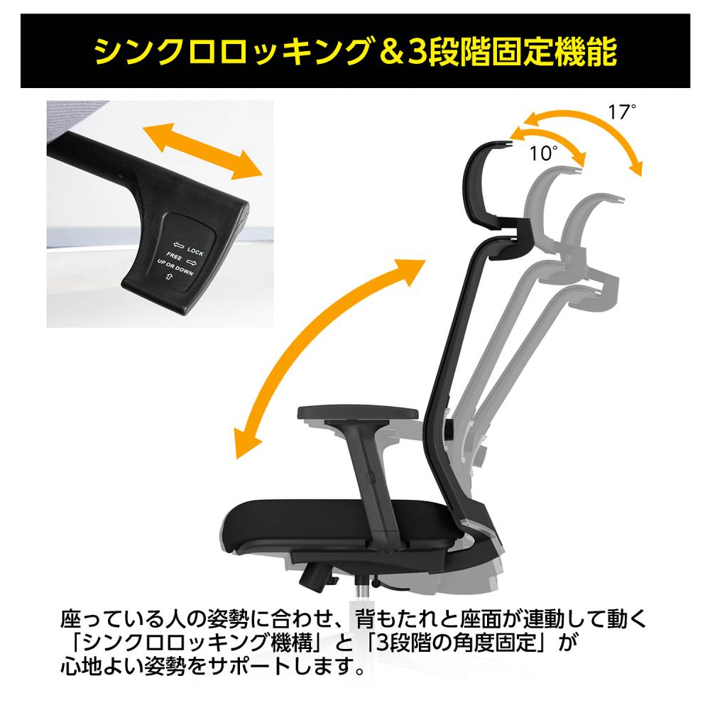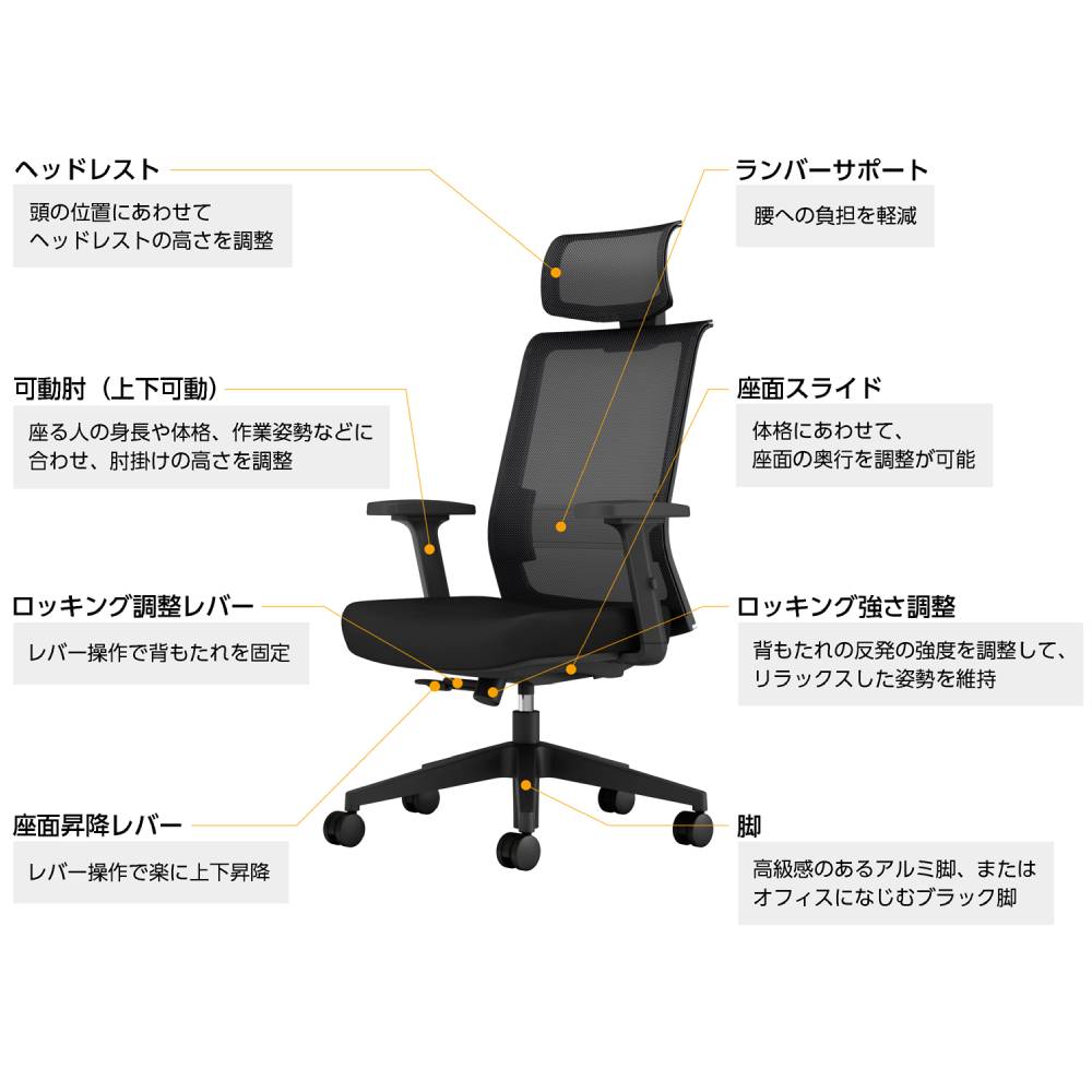 背:強化ナイロン、ポリプロピレン、金属(鋼) 座:合板、金属(鋼)、モールドウレタン 肘:強化ナイロン、ポリウレタンスキンモールド 脚:アルミ、ナイロンキャスター 張地:ポリエステル ●シンクロロッキング機構 ●ロッキング角度固定(3段階、0°、10°、17°) ●ロッキング強度調整 ●座面奥行調整(ストローク:50mm) ●座面上下昇降(ストローク:120mm) ●ランバーサポート調整(ストローク:45mm) ●肘高さ調整(ストローク:85mm) ●ヘッドレスト高さ調整(10段階・ストローク:40mm) |