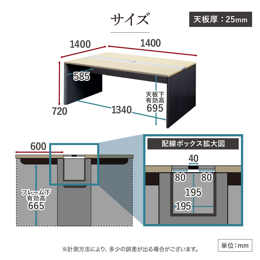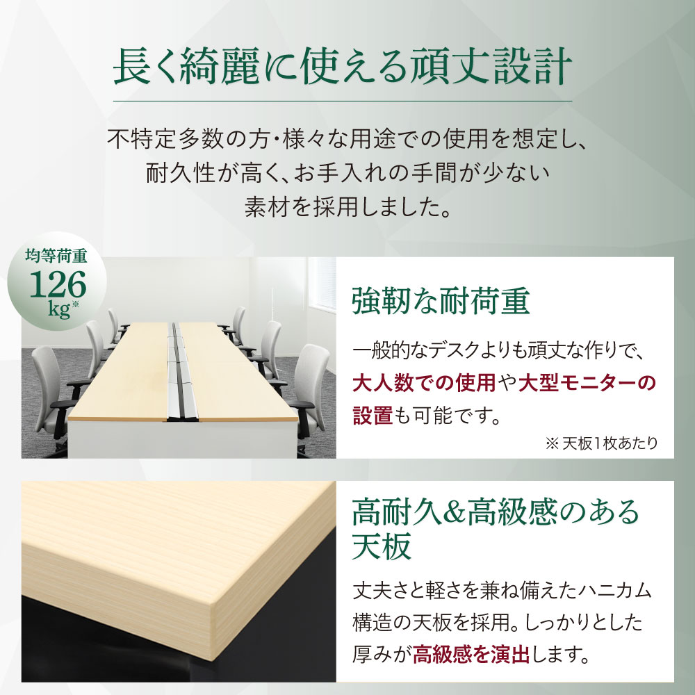 【脚】 スチール(粉体塗装) 【天板】 表面:合成樹脂化粧板(メラミンエンボス加工) 芯材:MDF+ハニカムコア エッジ:PVC 配線ボックス:スチール(粉体塗装) 配線カバー:アルミニウム合金 アジャスター:ABS 耐荷重:天板/126kg ●アジャスター付き ●配線ボックス付き |