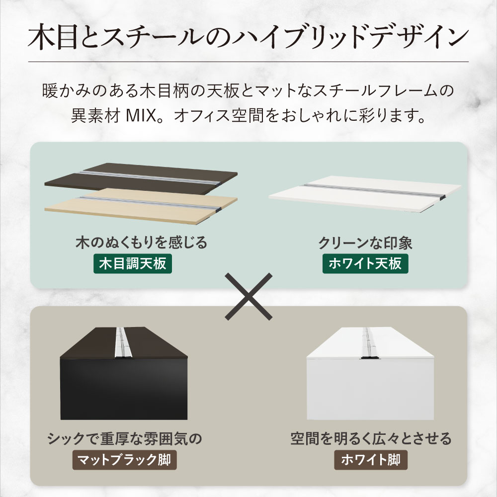| 高級感のある木製天板に直線的なスチールフレームがスタイリッシュなフリーアドレスデスクです。 充実した配線機能でケーブル類をすっきり収納可能。 アジャスター付きのパネル脚はガタツキを防ぎ安定感があります。 オプションの幕板を付ければ足元が気にならす快適です。 後から拡張可能な増連用パーツもございます。 |