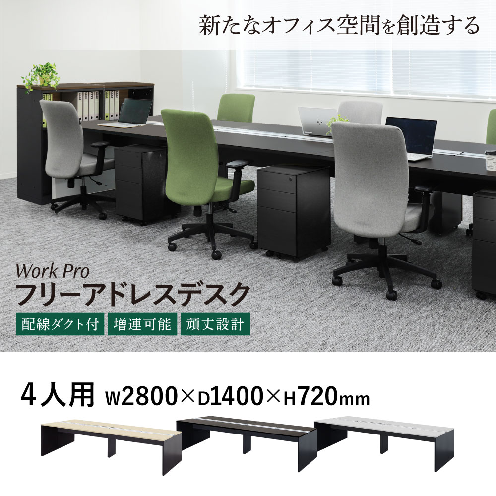 フリーアドレスデスク 4人用 幅2800×奥行1400mm 配線ボックス付き オフィスデスク WPF-2814