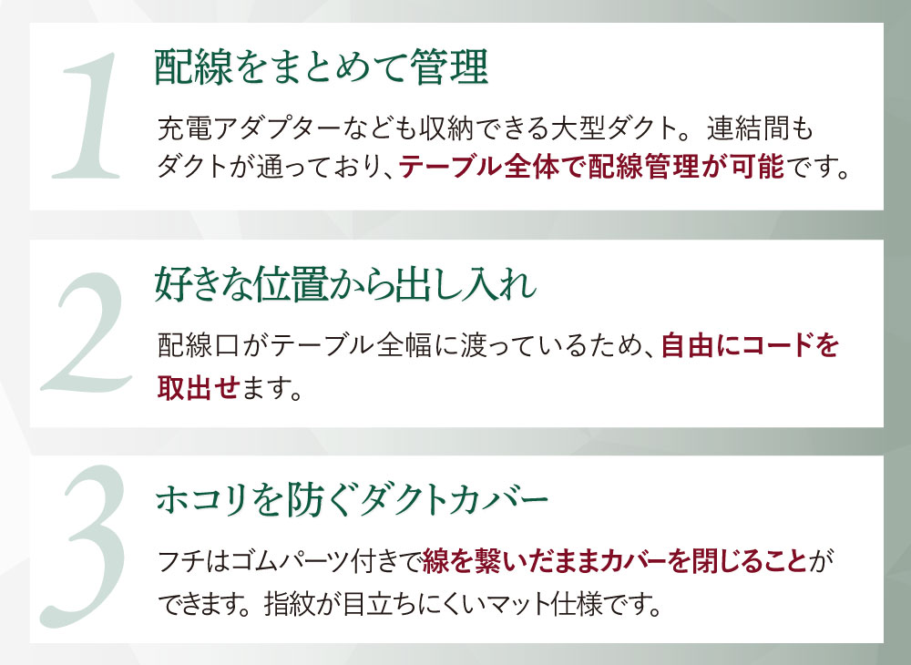 【脚】 スチール(粉体塗装) 【天板】 表面:合成樹脂化粧板(メラミンエンボス加工) 芯材:MDF+ハニカムコア エッジ:PVC 配線ボックス:スチール(粉体塗装) 配線カバー:アルミニウム合金 アジャスター:ABS 耐荷重:天板/126kg ●アジャスター付き ●配線ボックス付き |