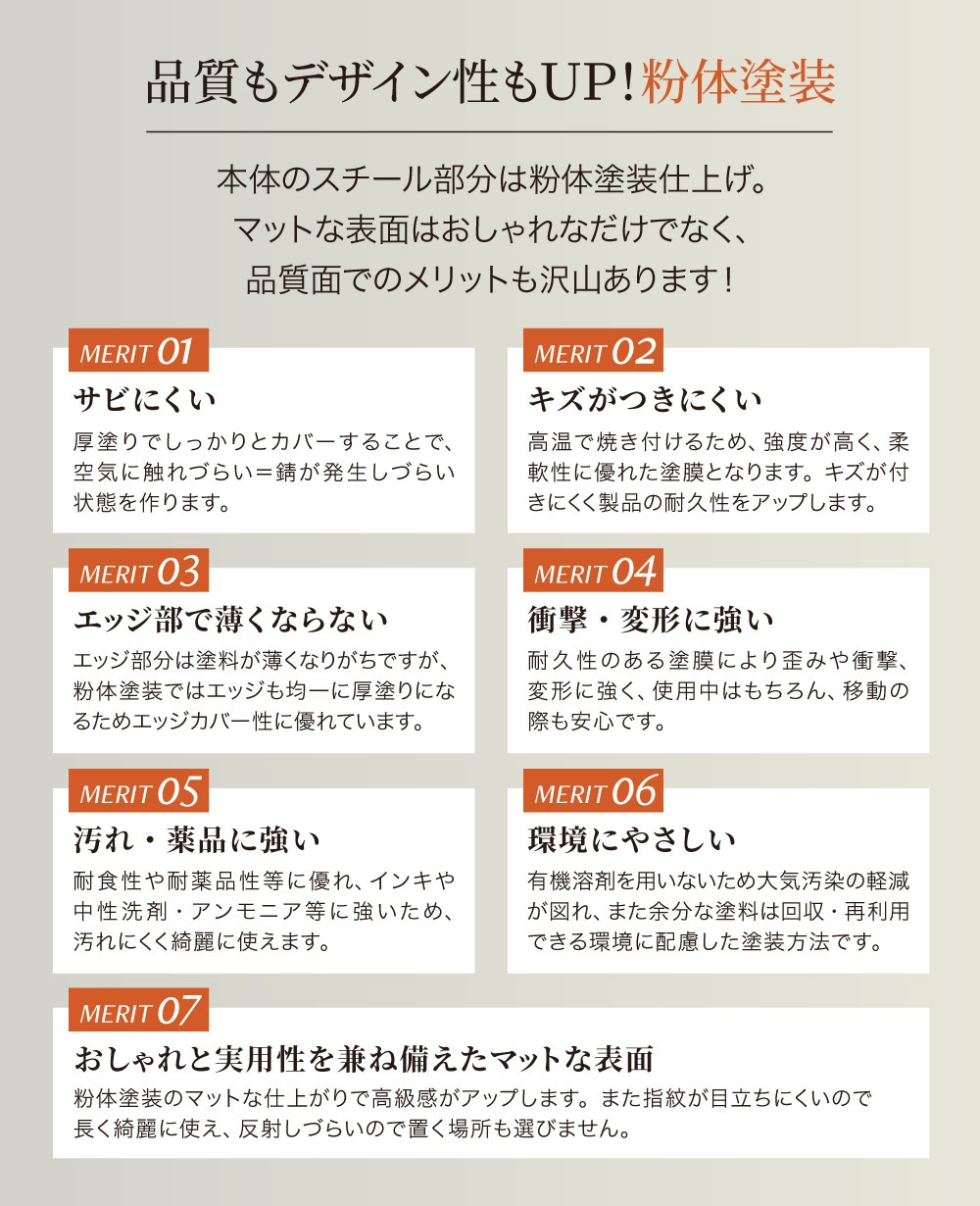 | 備考 | ●粉体塗装 シンナーなどの人体に有害な有機溶剤を使わない、しかも吹き付けた後に残った塗料を再利用する環境にやさしい塗装方法です。また、キズやサビに強く、耐久性・汚染性にも優れています。 |