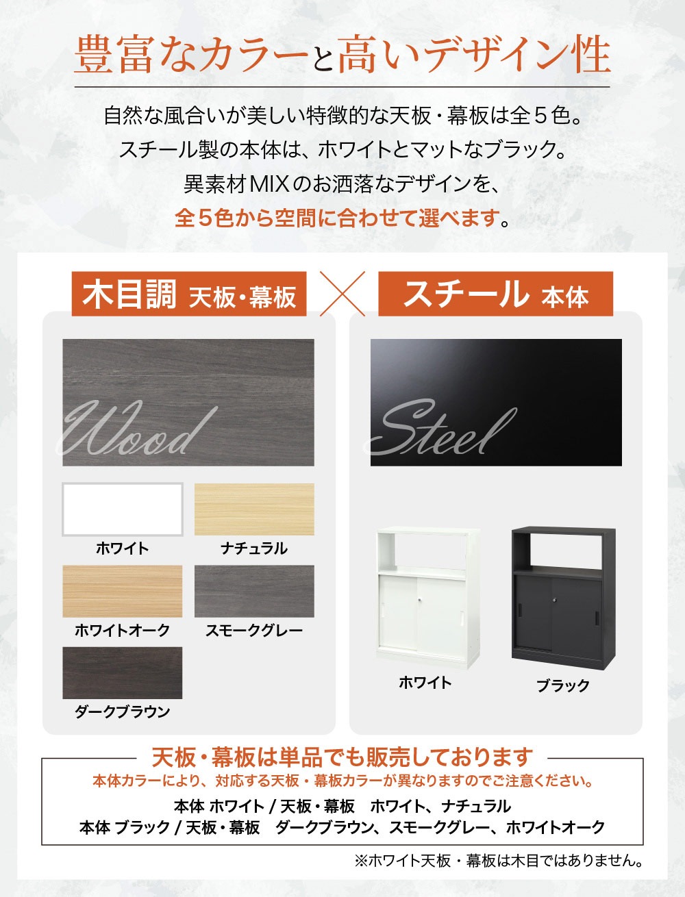 本体カラーホワイト:天板・幕板カラー ホワイト、ナチュラル 本体カラーブラック:天板・幕板カラー ホワイトオーク、スモークグレー、ダークブラウン |