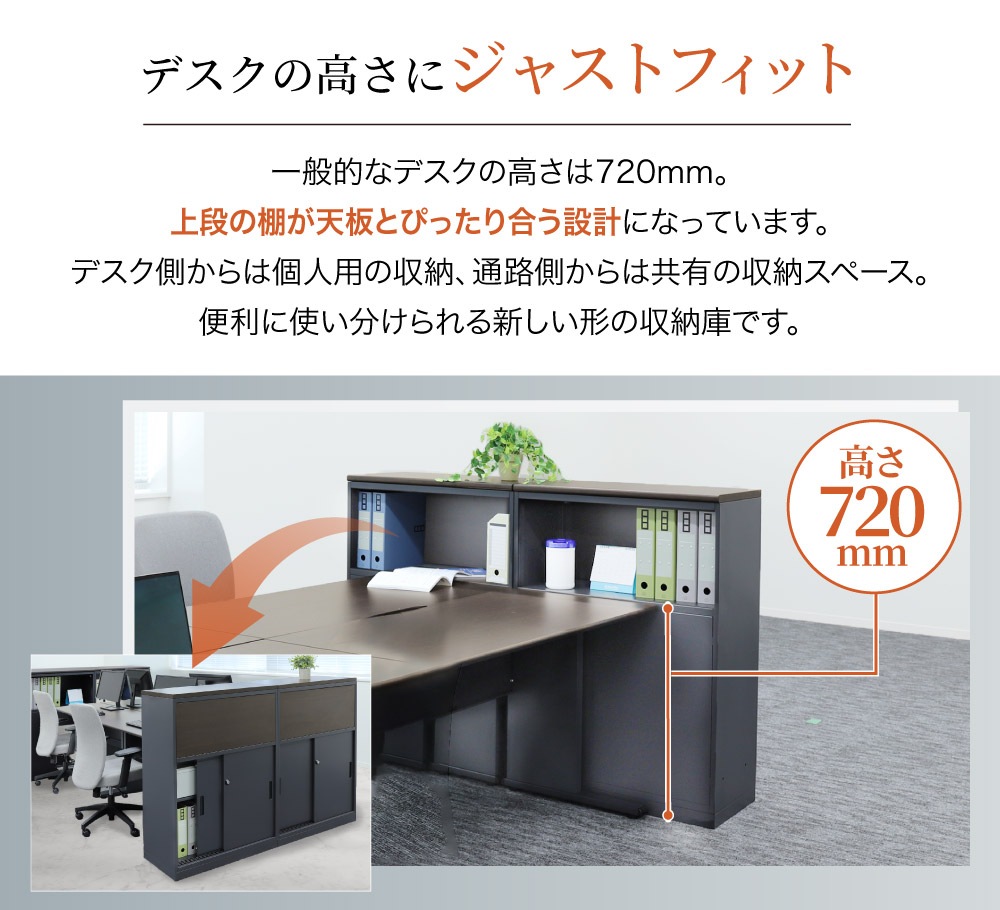 様々な場所や用途に使える便利なマルチキャビネット。 上段はオープン収納、下段は鍵付きの引戸書庫になっています。 島型にレイアウトしたデスクの端に置いたり、間仕切りにしたり、様々な使い方が可能です。 高さは約110cmあるので、ハイカウンターや受付台、演台としても活躍! オプション(別売り)で木目が美しい天板と幕板を取付けることも可能です。 |