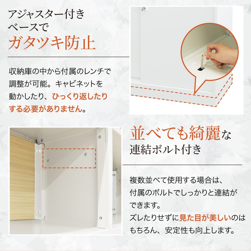 本体・ベース:スチール(粉体塗装) 側板:メラミン樹脂化粧板、パーティクルボード ●アジャスター付 ●フラッシュハニカム構造 |