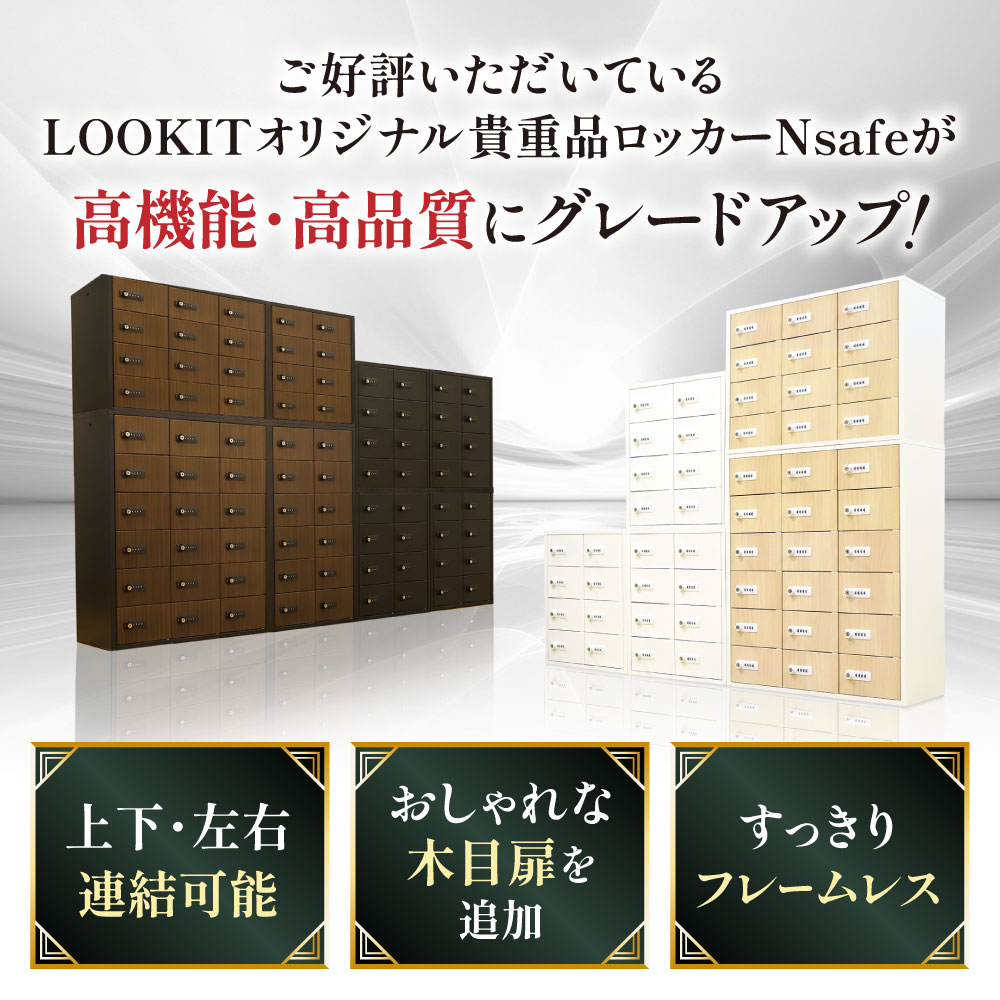 | 人気のNsafeシリーズに上下連結・左右連結が可能な新タイプが登場!貴重品ロッカーと専用ベースのセットです。 置き場所の小さいバックヤードからオフィス・学校など大人数での使用まで幅広く対応します。 鍵の管理の不要なダイヤル式のため、ジムや入浴・宿泊施設など不特定多数の方の使用するシーンにもおすすめです。 暗証番号を忘れても付属のキーを使用して番号検索ができます。 壁・床へ固定可能です。※固定用ビスは付属していません |
