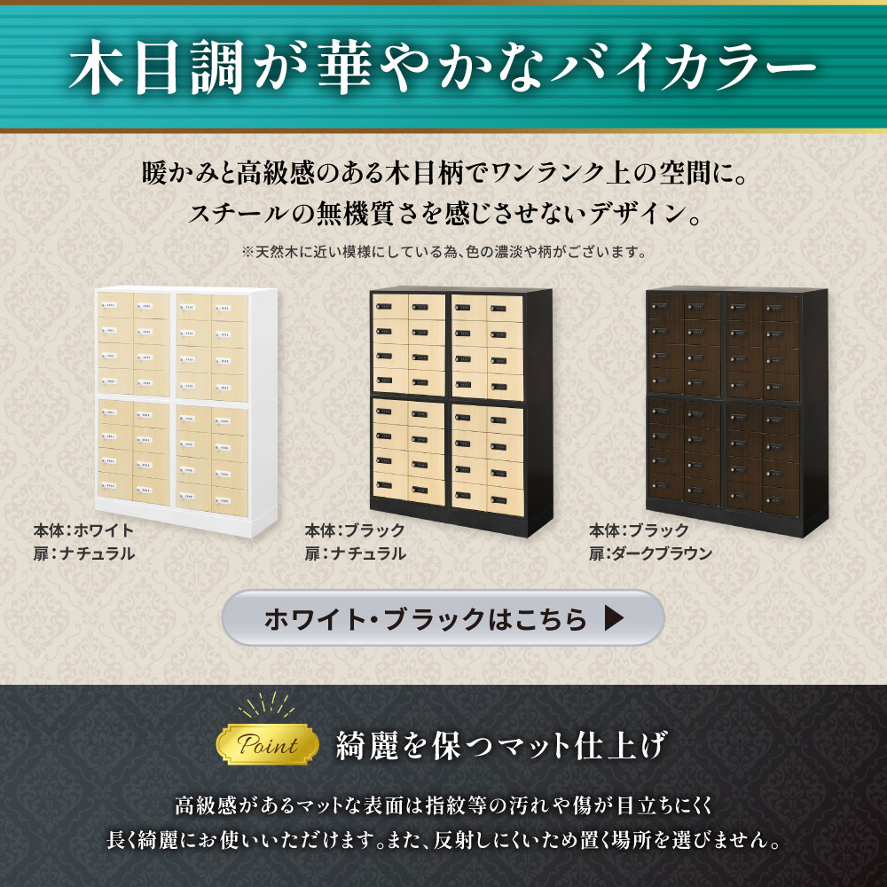 | カラー | ■貴重品ロッカー 本体/扉:ホワイト/ナチュラル、ブラック/ナチュラル、ブラック/ダークブラウン ■ベース ホワイト、ブラック |