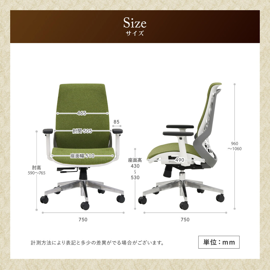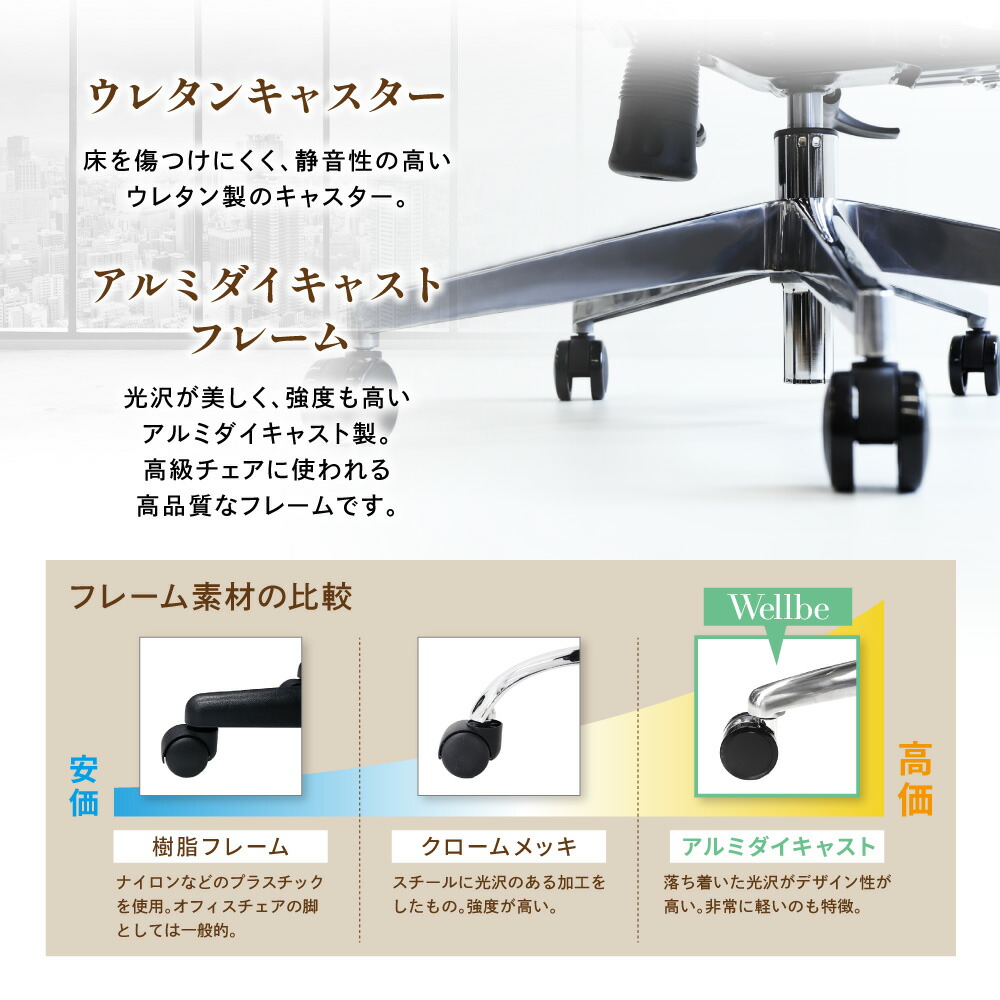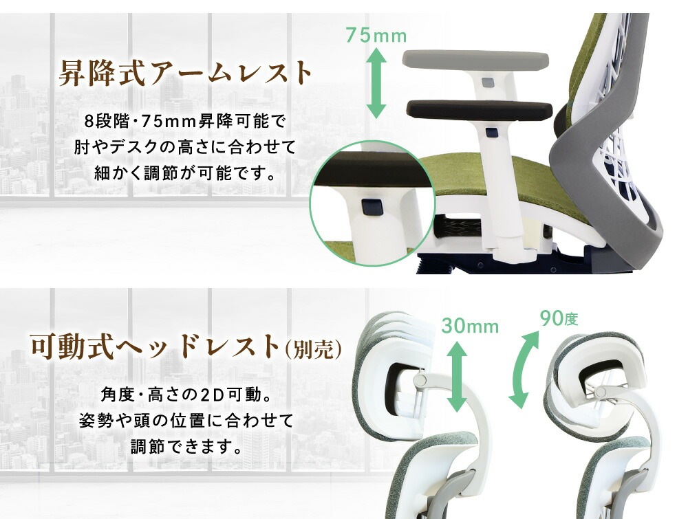 背座フレーム:ナイロン 肘:ナイロン、ポリウレタン 脚部:アルミナム キャスター:ポリウレタン 生地:ポリエステル 座面:モールドウレタン ●座面昇降 ●座面スライド ●可動式アームレスト ●可動式ランバーサポート ●シンクロロッキング |
