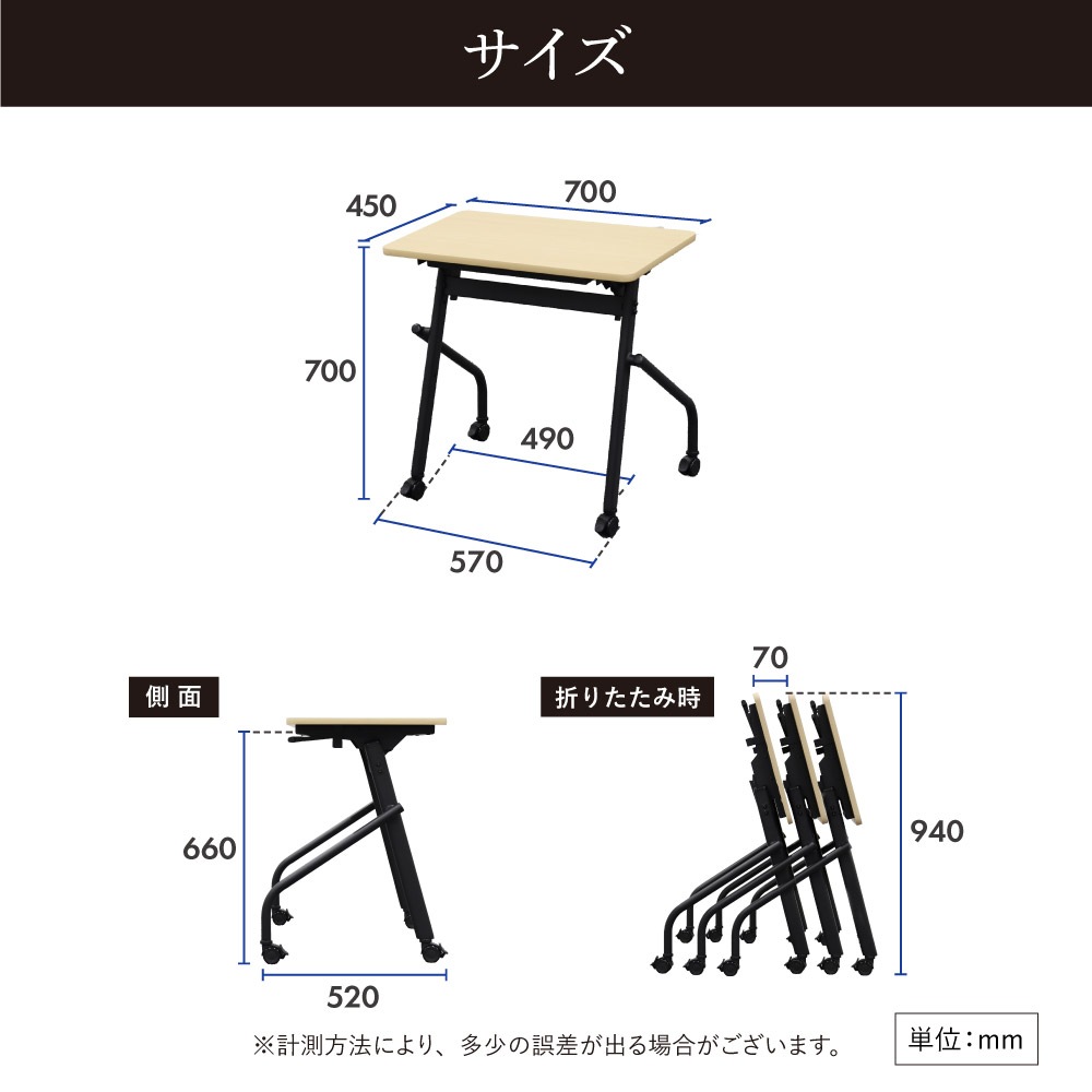 会議用テーブル 幕板なし 幅700×奥行450mm 平行スタッキング ソフトエッジ巻き HST-7045