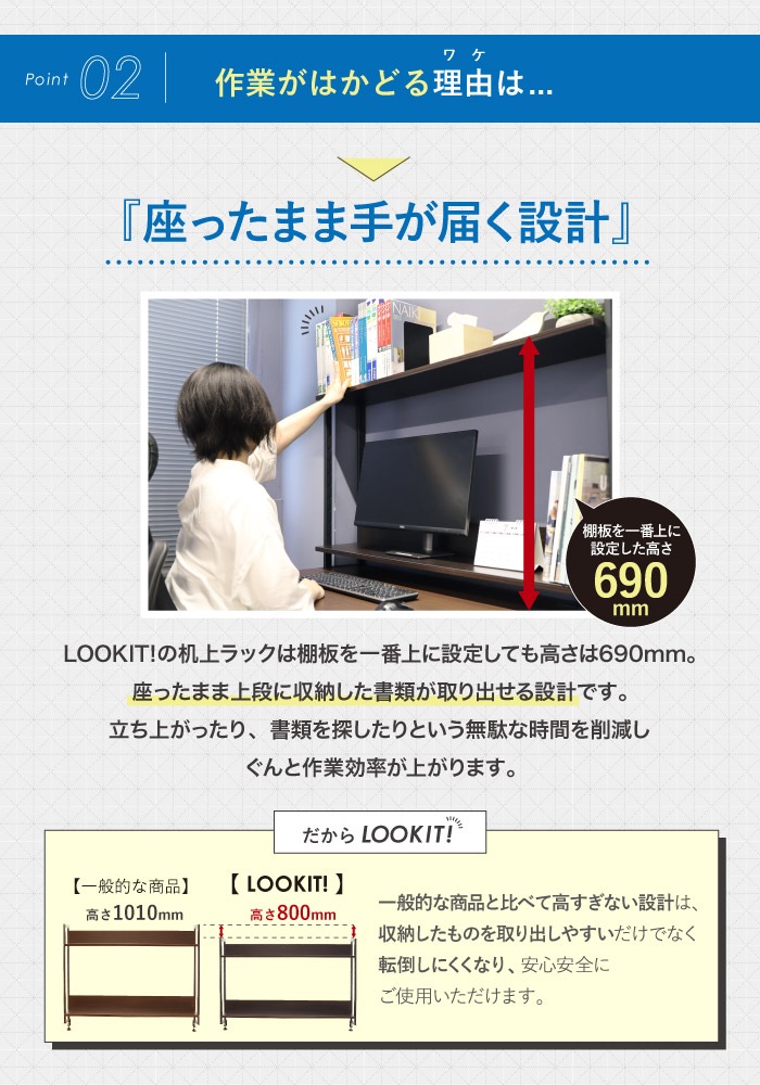 | サイズ | ■デスク 外寸:幅1000×奥行700×高さ700mm 重量:18.1kg ■机上ラック 外寸:幅990×奥行250×高さ805mm 重量:8.5kg 商品は3梱包でお届け致します。 |