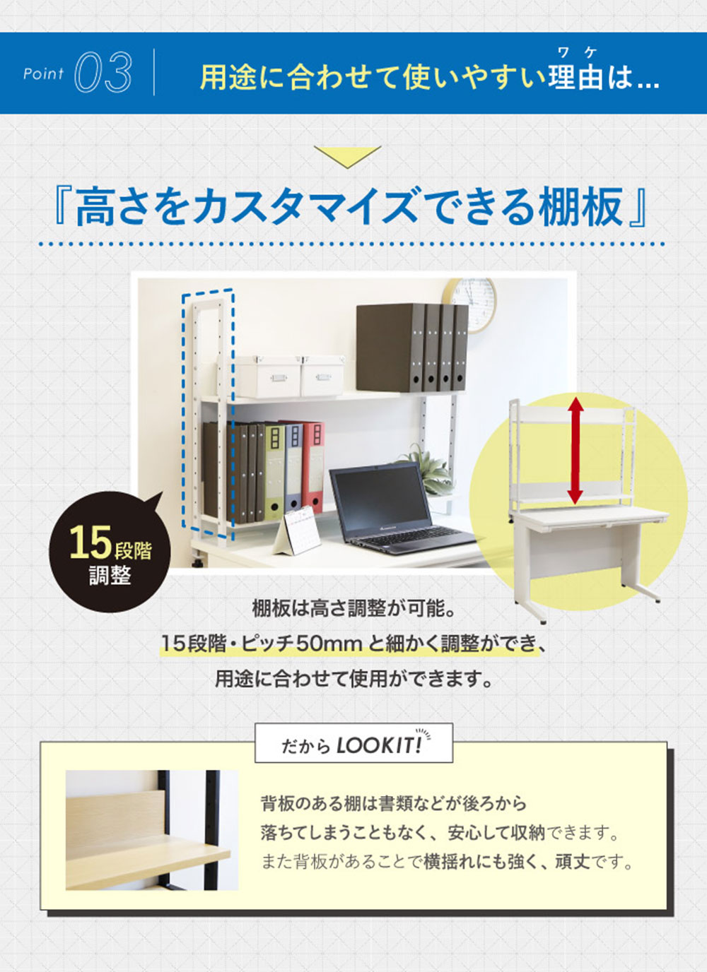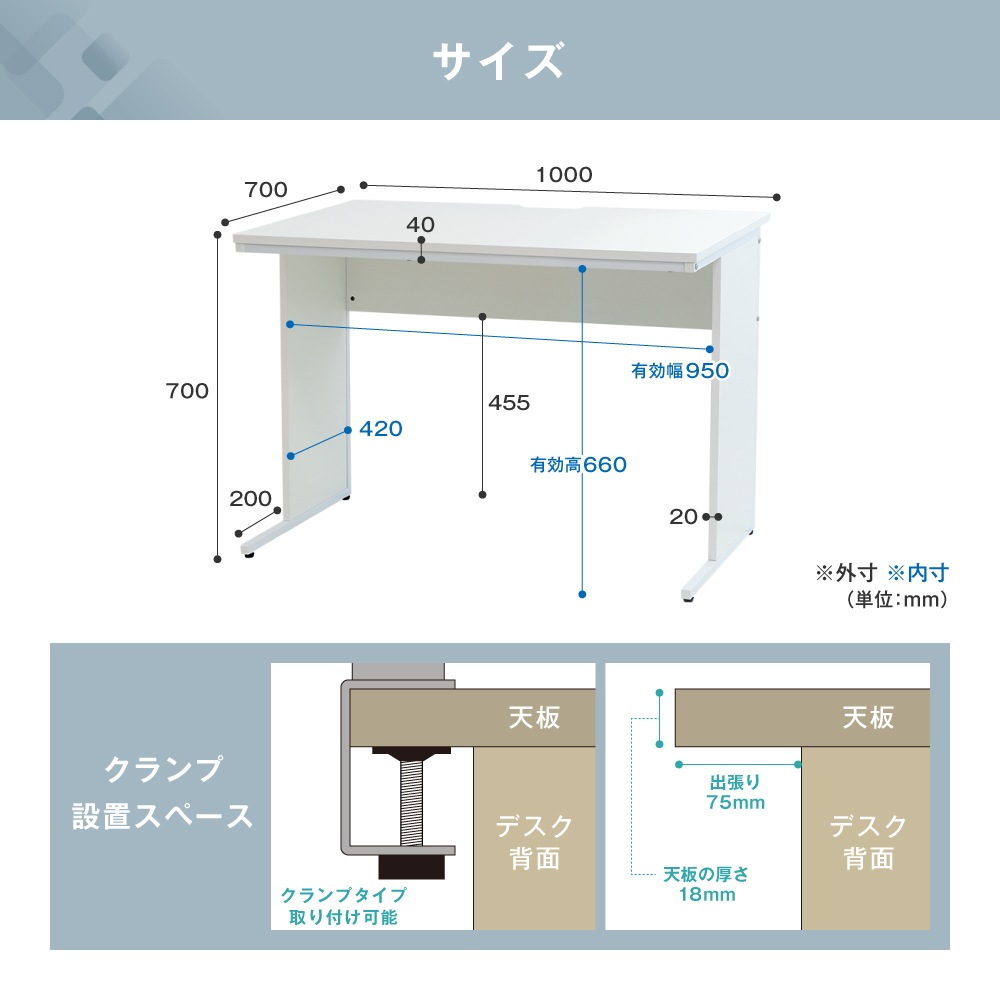 ■デスク 天板・幕板:MDF+メラミン樹脂化粧板 エッジ:PVC 脚:スチール(粉体塗装) アジャスター:ポリプロピレン ■机上ラック 棚板:メラミン樹脂化粧板 エッジ:PVCエッジ フレーム:スチール(粉体塗装) クランプ:スチール(粉体塗装)、合成樹脂 |