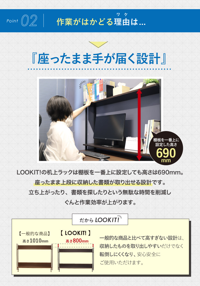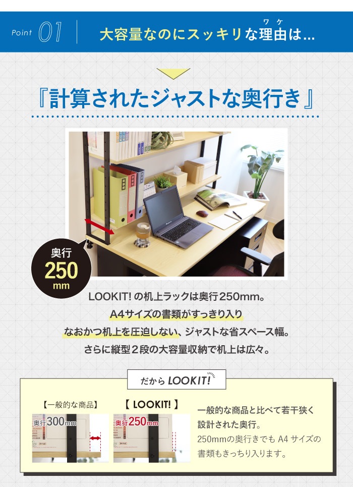 | ワークデスクと机上ラックの2点セット。 【デスク】 あたたかみのある木製天板と、頑丈なスチールのフレーム。機能性とデザイン性に優れたハイブリッドデスクです。 メラミンシート加工で木板の反りや割れを防ぎ、耐久性を向上。 耐荷重50kgなので、机上ラックの設置も可能です。天板は便利な配線スリット付き。 【机上ラック】 様々なデスクに取り付けられる机上ラック。 書類などをスッキリと収納できる2段の大容量収納で、デスク周りを整頓できます。 A4サイズの書類がすっきり入り、なおかつ机上を圧迫しない省スペースでジャストな奥行。 座ったまま上段に収納した書類が取り出せる仕様で、作業効率もアップします。 棚板は高さ調整が可能。用途に合わせて使用できます。 |