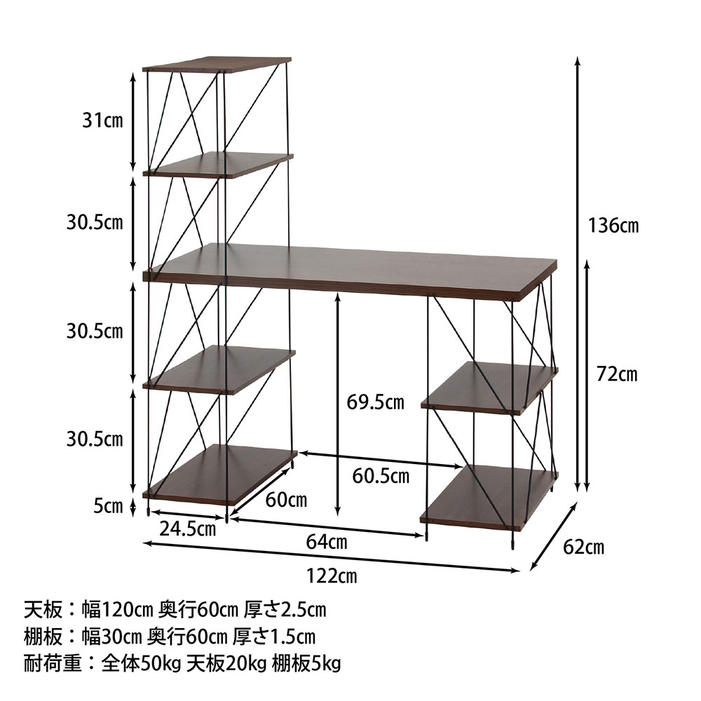 | サイズ | 外寸:幅1220×奥行620×高さ1360mm 重量:25.5kg 耐荷重:(全体)50kg、(天板)20kg、(棚板)5kg 梱包外寸:幅1415×奥行715×高さ75mm 梱包重量:27.5kg |