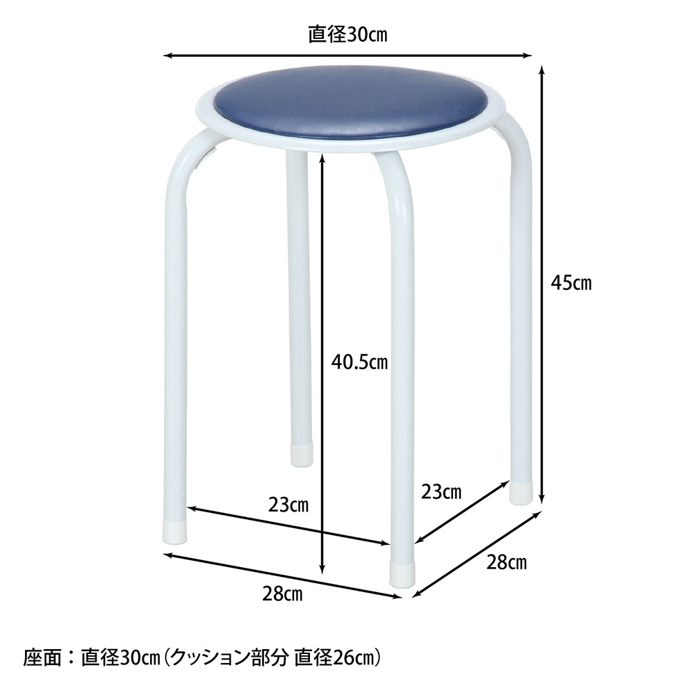 | サイズ | 外寸:幅300×奥行300×高さ450(座面高450)mm 重量:1.5kg 耐荷重:(座面)80kg 座面直径:300mm 座面クッション直径:260mm 脚部鉄厚:1mm 梱包外寸:幅385×奥行380×高さ690mm 梱包重量:20.5kg |