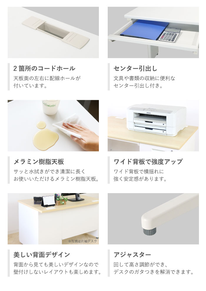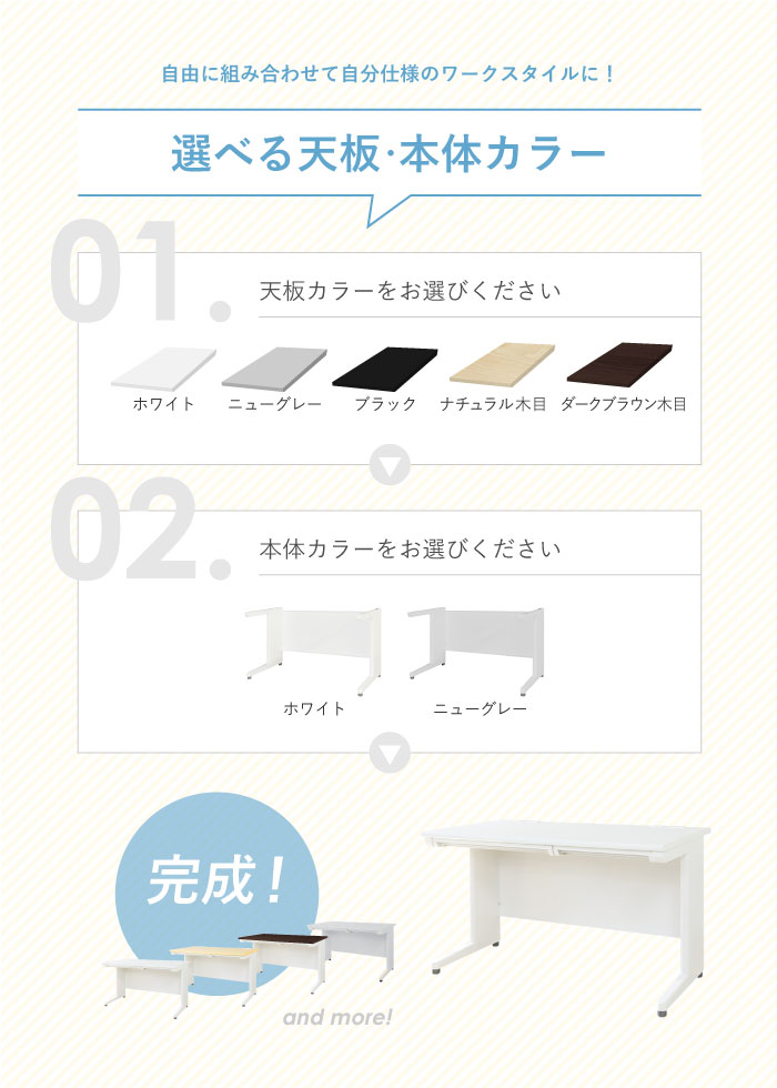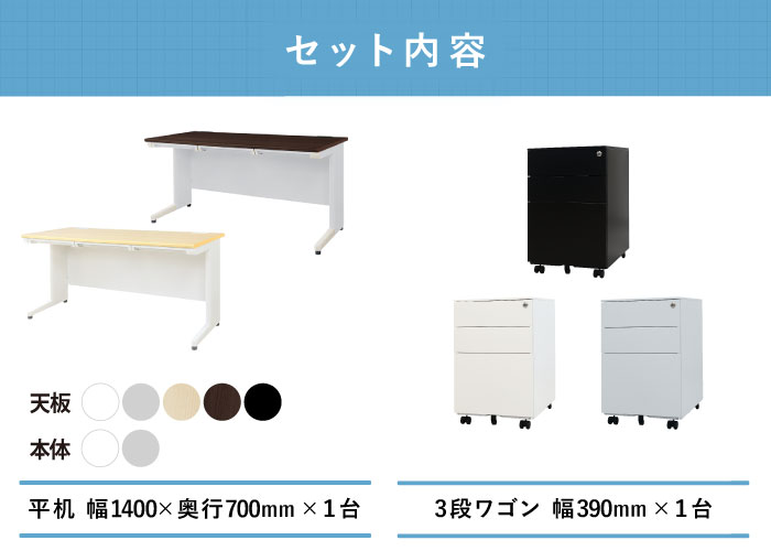 | カラー | ■デスク 天板カラー:ホワイト、ニューグレー、ブラック、ナチュラル(木目調)、ダークブラウン(木目調) 本体カラー:ホワイト、ニューグレー ■ワゴン ホワイト、ブラック、ニューグレー |