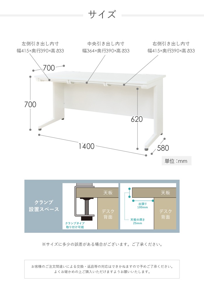 | サイズ | ■デスク 外寸:幅1400×奥行700×高さ700mm 左側引き出し内寸:幅415×奥行390×高さ33mm 中央引き出し内寸:幅364×奥行390×高さ33mm 右側引き出し内寸:幅415×奥行390×高さ33mm 天板厚み:約25mm 幕板から天板先までの長さ:約100mm ■ワゴン 外寸:幅390×奥行500×高さ600mm 引き出し有効内寸(上段):幅325×奥行460×高さ65mm 引き出し有効内寸(中段):幅325×奥行460×高さ65mm 引き出し有効内寸(下段):幅325×奥行460×高さ245mm 商品は4梱包でお届け致します。 |