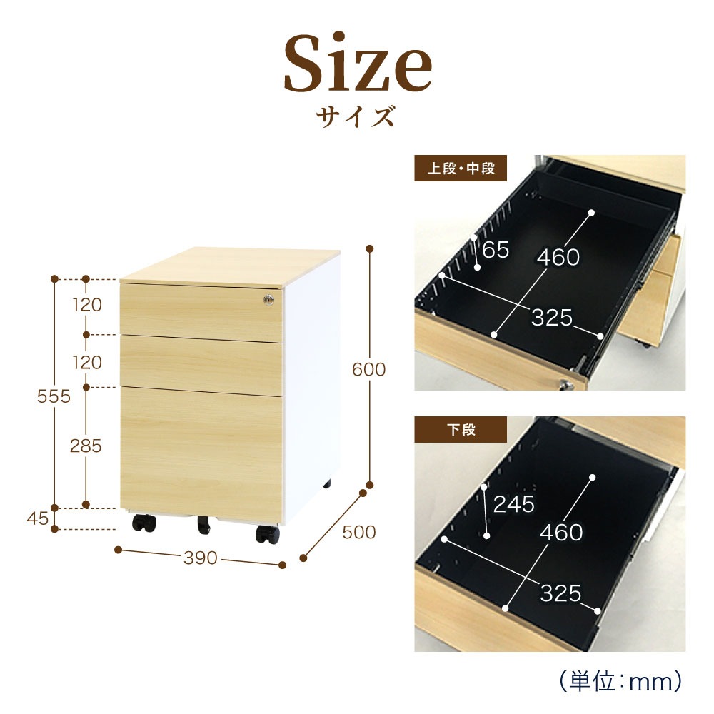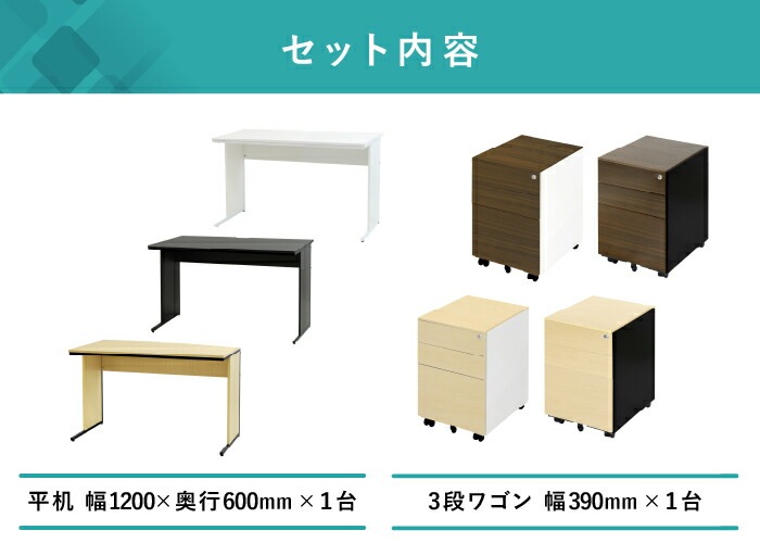 | サイズ | ■デスク 外寸:幅1200×奥行600×高さ700mm 重量:19.9kg ■ワゴン 外寸:幅390×奥行500×高さ600mm 引き出し有効内寸(上段):幅325×奥行460×高さ65mm 引き出し有効内寸(中段):幅325×奥行460×高さ65mm 引き出し有効内寸(下段):幅325×奥行460×高さ245mm 商品は3梱包でお届け致します。 |