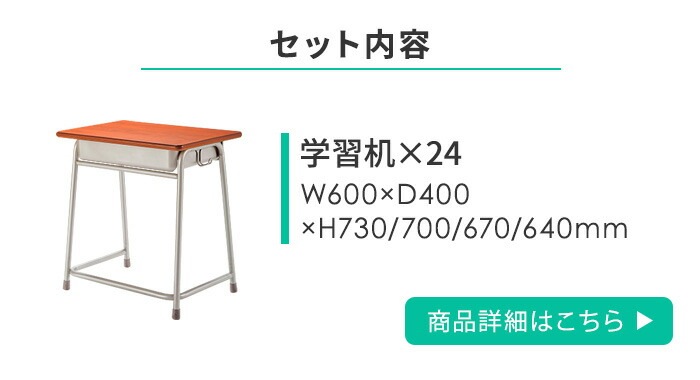 | 特記事項 | セット内容:デスク(59-G2-D-BK12)×24、チェア(59-GG-C)×24 ※旧JIS規格対応商品です。 ※号数によって、サイズが変わります。 |
