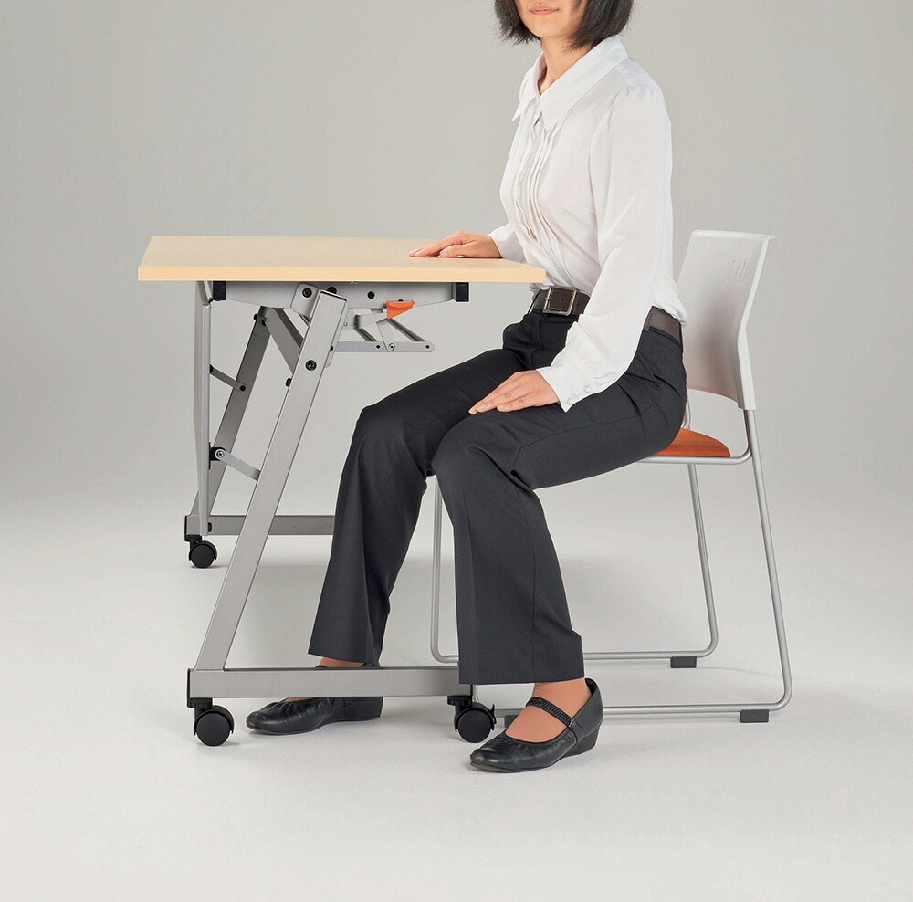 | 左右から出入りしやすいL字脚形状のフォールディングテーブル。 天板下部のレバー操作でロックが解除され、天板を折りたたむことができます。 テーブル前後の間隔が狭い場合も横方向からの出入りが容易です。 |
