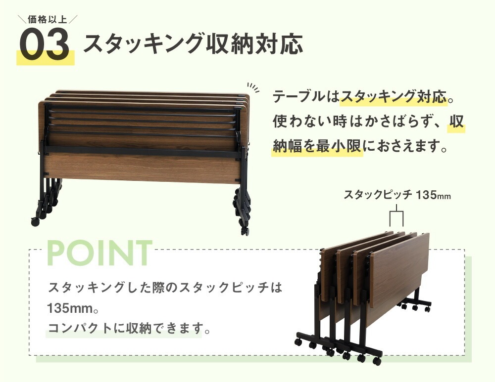 | フォールディングテーブルとスタッキングチェアのセットです。 【テーブル】 天板には軽さと高い強度が特徴のハニカム構造を採用。 厚さ30mmのしっかりした作りでありながら、移動のしやすい重量を実現しました。 操作感の軽いレバーで片手でらくらくと折りたたむことができます。 スタッキング収納対応。幕板は取り付け・取り外しが自由です。 様々な空間に馴染むシンプルなデザインで、カラーは3色。 明るく清潔感のある定番のホワイト、ブラックのフレームで重厚な雰囲気のウォールナット、上品な木目の美しいナチュラルからお選び頂けます。 【チェア】 人間工学に基づく設計の大型背面と、ほどよい弾力のソフトな座面のミーティングチェアです。 最大6脚までスタッキングが可能なので、使わない時は重ねてコンパクトに収納が可能。 わずか4.8kgと軽量で、背もたれには取っ手もついているので、設置や片付けもラクラクです。 お届け後すぐにご使用いただける完成品です。 |