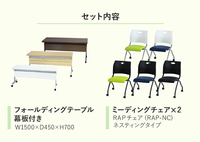 | 特記事項 | セット内容:テーブル(NF-GLF-1545)×1、幕板(NF-GLF-1500M)×1、チェア(NF-Rap-NC-S)×2 |