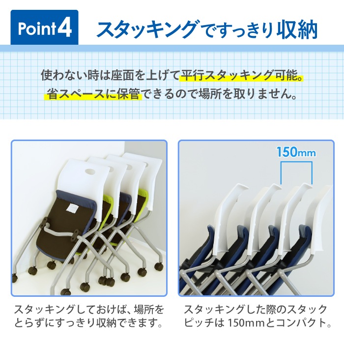 | 会議用テーブルとミーティングチェアのセットです。 【テーブル】 天板には軽さと高い強度が特徴のハニカム構造を採用。 厚さ30mmのしっかりした作りでありながら、移動のしやすい重量を実現しました。 操作感の軽いレバーで片手でらくらくと折りたたむことができ、スタッキング収納可能です。 【チェア】 人間工学に基づく設計の大型背面と、ほどよい弾力のソフトな座面のミーティングチェアです。 使わない時は平行スタッキングでコンパクトに収納が可能。 軽量でキャスター付き、背もたれには取っ手もついているので、設置や片付けもラクラクです。 |