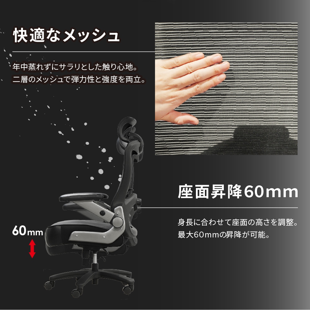 | “チェア界の横綱”と呼ぶにふさわしい、頼もしさと快適さを兼ね備えたチェアです。 通気性の高いメッシュタイプ。 200kgの耐荷重に対応し、体格の大きな方でも安心してゆったり座れます。 座面は広く、あぐらをかけるほどの余裕があり、長時間の作業にも最適です。 |