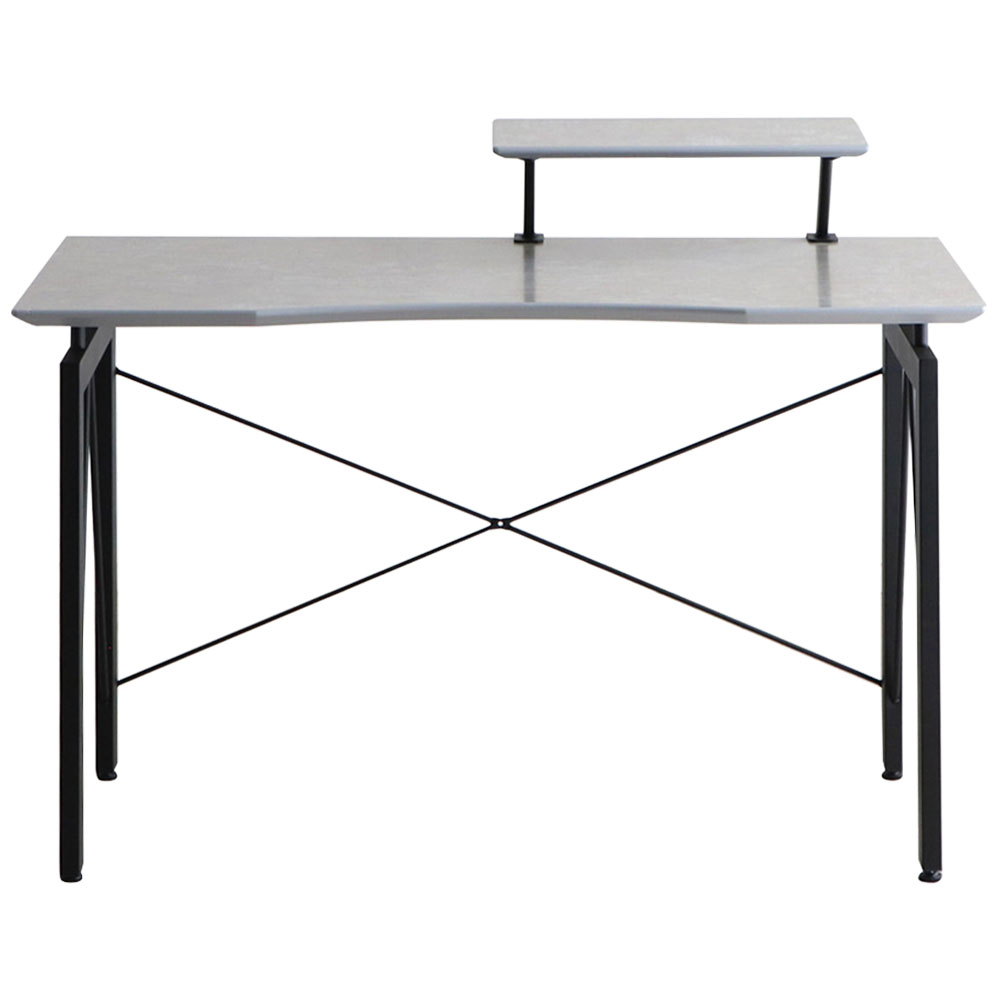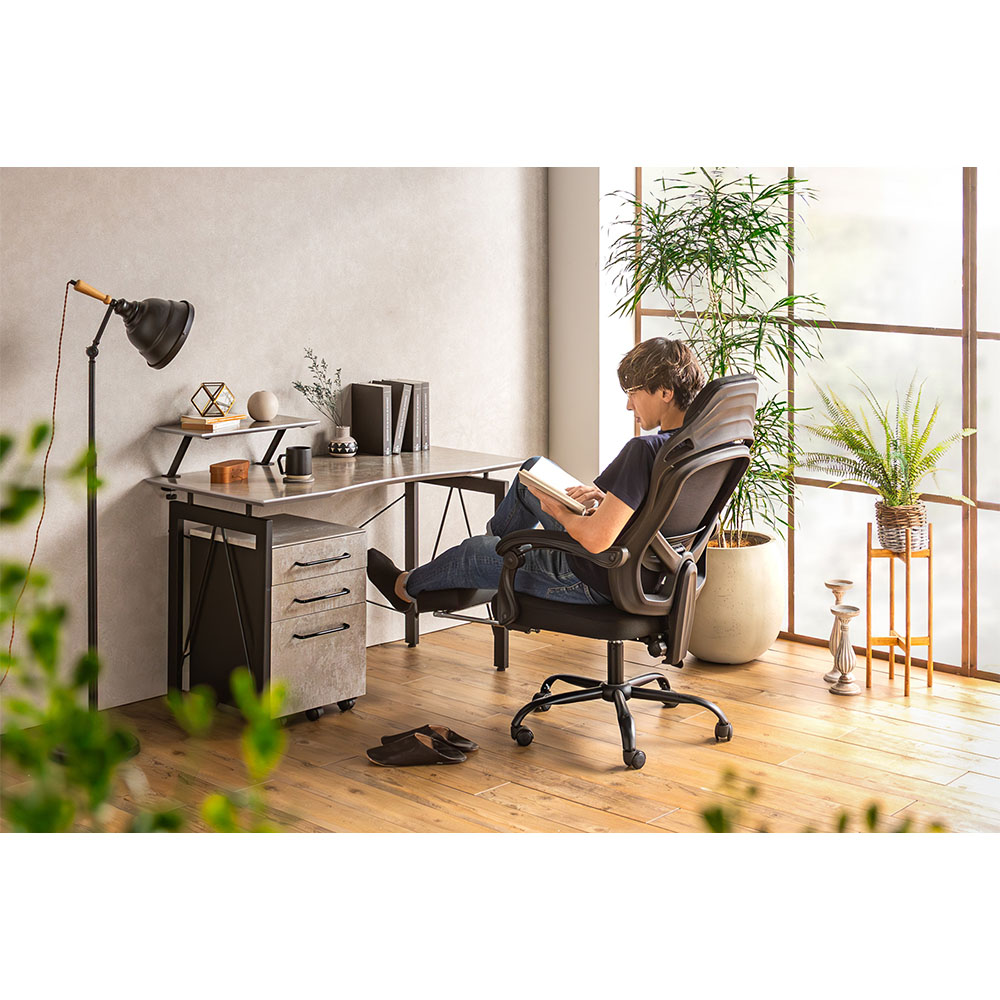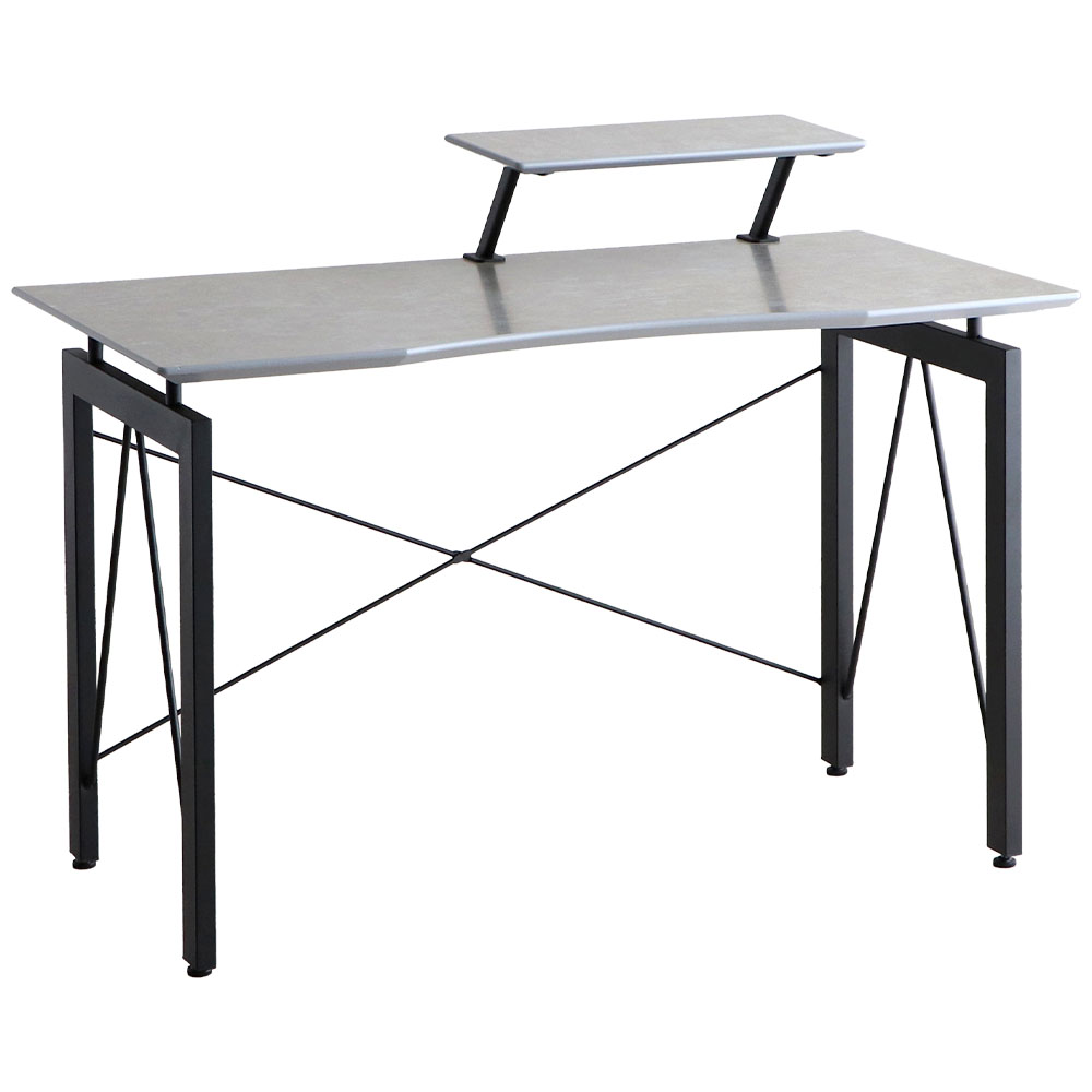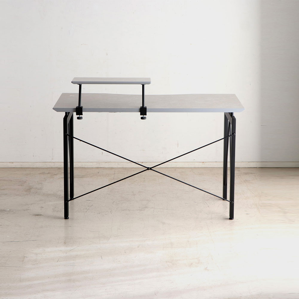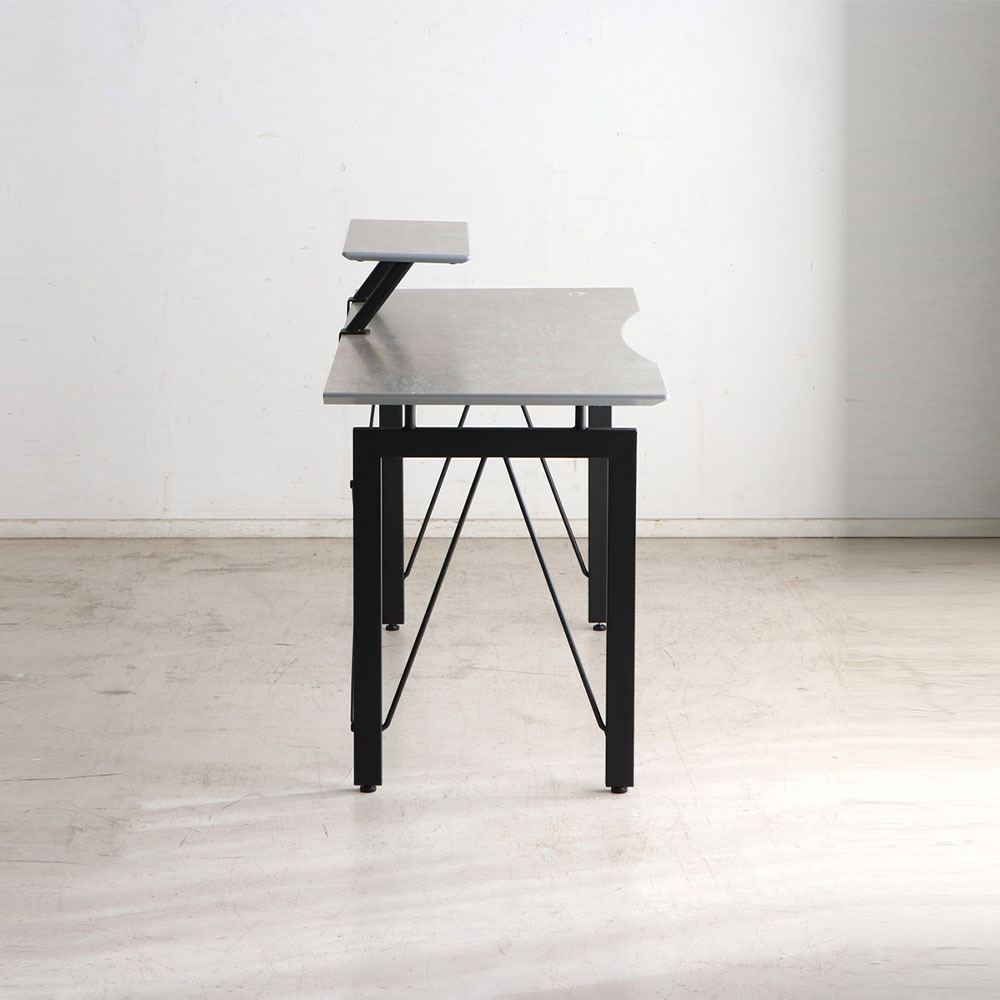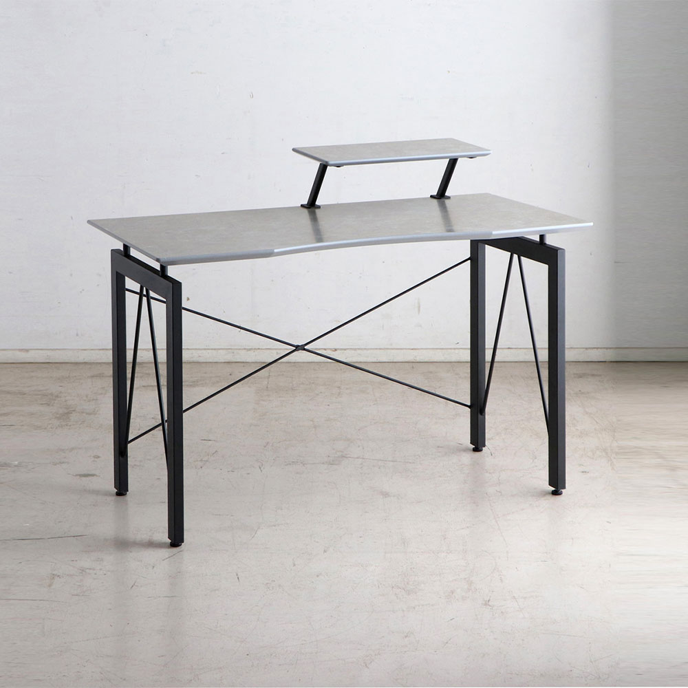 | シンプルでスタイリッシュなデスク。 コンクリート調のポリ天板、黒のスチール脚が組み合わさったおしゃれなデスクです。 可動できる上棚は、パソコン台にしてキーボードを下にしまうなどさまざまな使い勝手を実現してくれます。 同シリーズのワゴンを追加すること収納力を拡張できます。 |