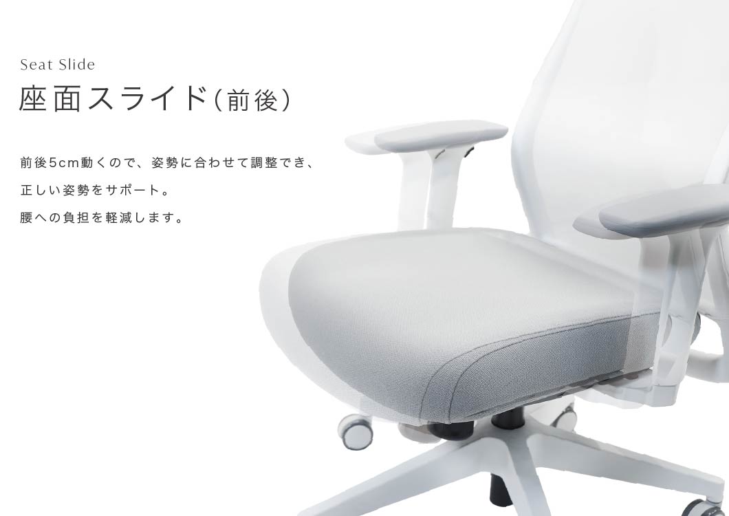 背もたれ:ガラス繊維強化ポリアミド(GF)メッシュ+ナイロンフレーム 座面:ファブリック+モールドウレタン+ナイロンベース ヘッドレスト:ガラス繊維強化ポリアミド(GF)メッシュ+ナイロンフレーム ハンガー:ポリプロピレン アームレスト:ポリウレタン シリンダー:クラス3リフト ベース:ナイロン キャスター:60mmポリウレタン 耐荷重:100kg ●3Dアームレスト(3方向可動) ●シンクロロッキング(3段階固定) ●リクライニング(最大135度) ●座面前後スライド |