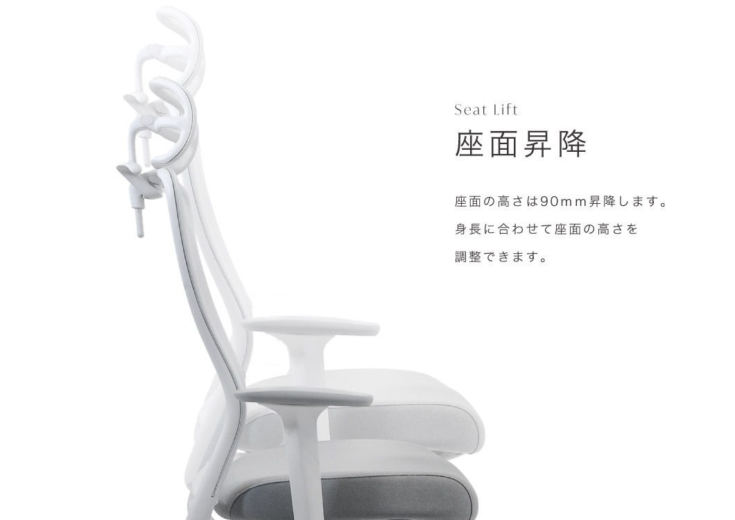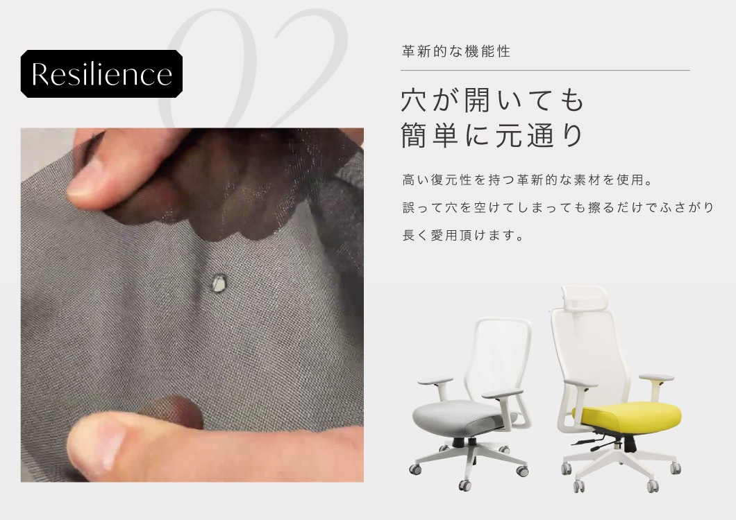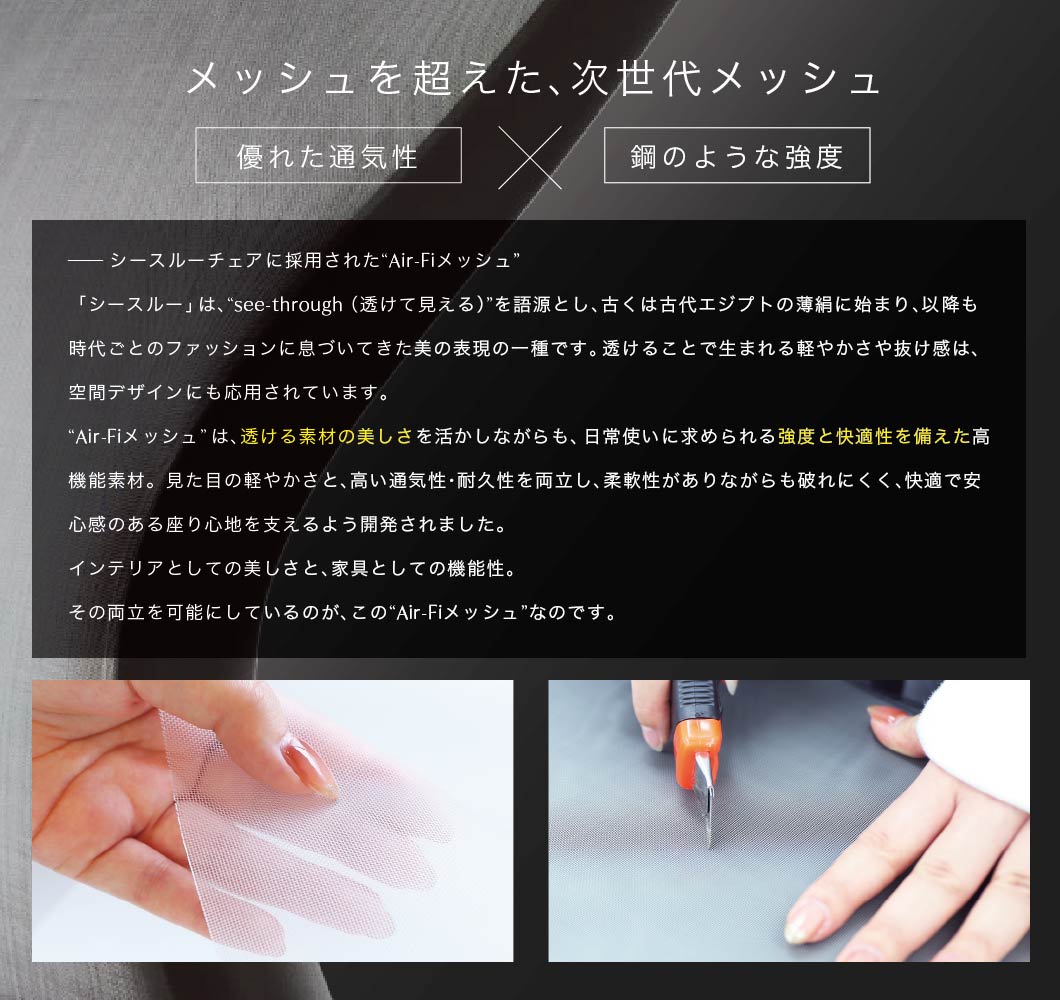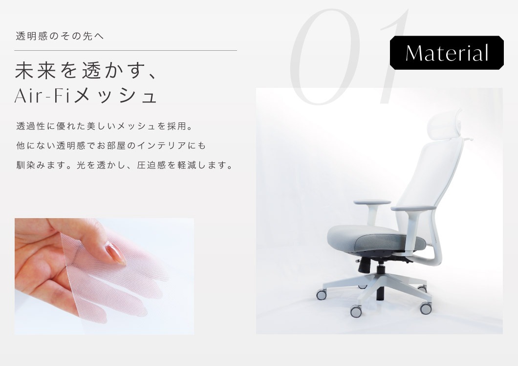 | 透過性の高い素材を採用した、未来的な美しさと快適性を両立した次世代チェア。 背面に用いた『Air-Fiメッシュ』は、優れた通気性と視覚的な軽やかさを実現し、空間に圧迫感を与えません。 破れが広がりにくい特殊構造で、復元力に優れ、長期間の使用にも安心。 計算された美しい形状は、長時間の作業時も快適な姿勢をサポートします。 全60通りから選べるセミオーダー仕様で、使用シーンや好みに応じた一脚を実現。 国内組立による高品質な製品です。 |
