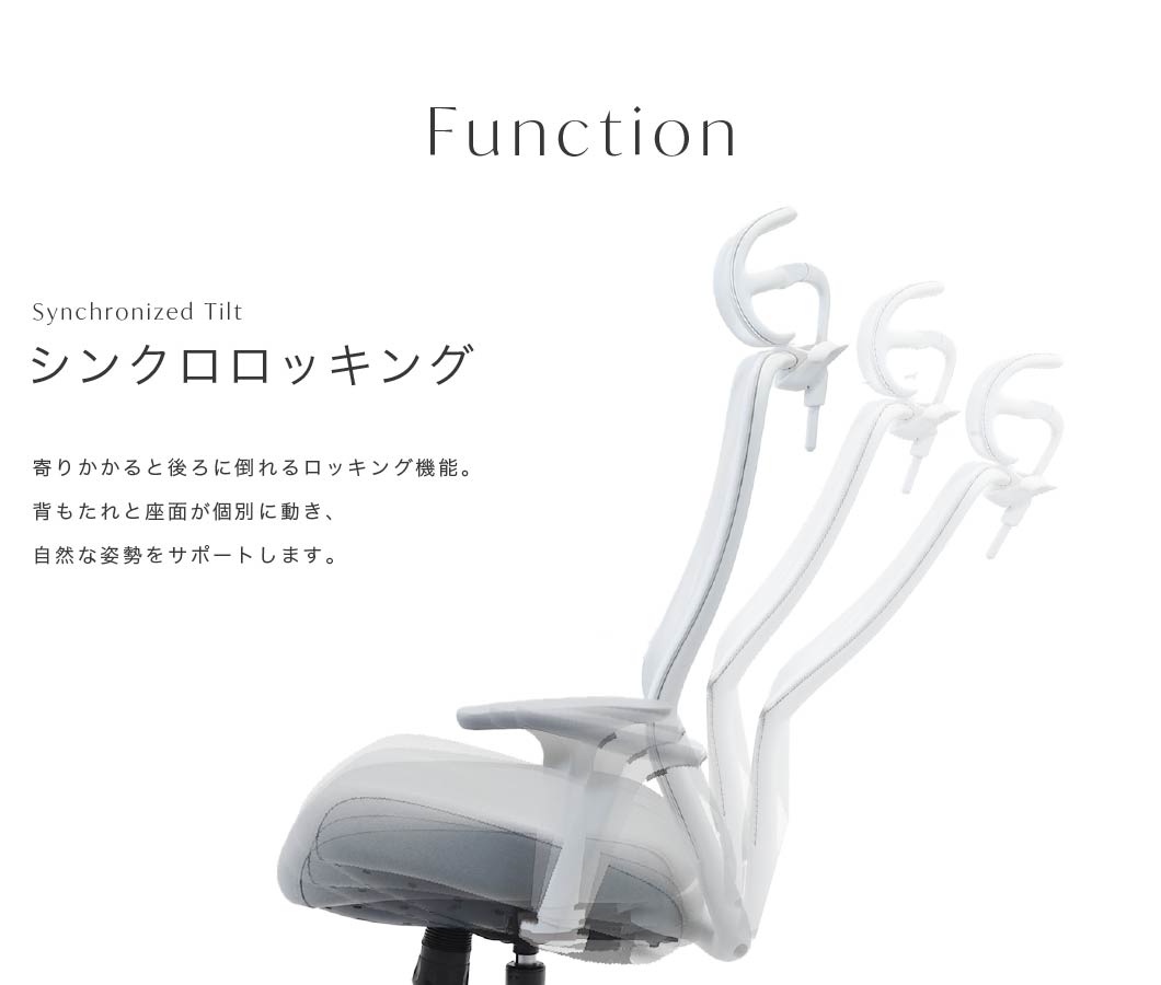 背もたれ:ガラス繊維強化ポリアミド(GF)メッシュ+ナイロンフレーム 座面:ファブリック+モールドウレタン+ナイロンベース ヘッドレスト:ガラス繊維強化ポリアミド(GF)メッシュ+ナイロンフレーム ハンガー:ポリプロピレン アームレスト:ポリウレタン シリンダー:クラス3リフト+クロムメッキ ベース:アルミ キャスター:60mmポリウレタン+メッキ塗装 耐荷重:100kg ●3Dアームレスト(3方向可動) ●シンクロロッキング(3段階固定) ●リクライニング(最大135度) ●座面前後スライド |