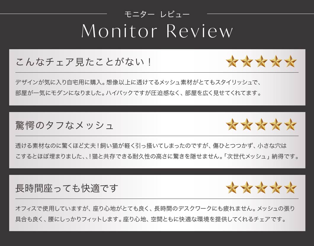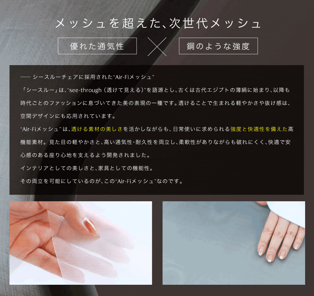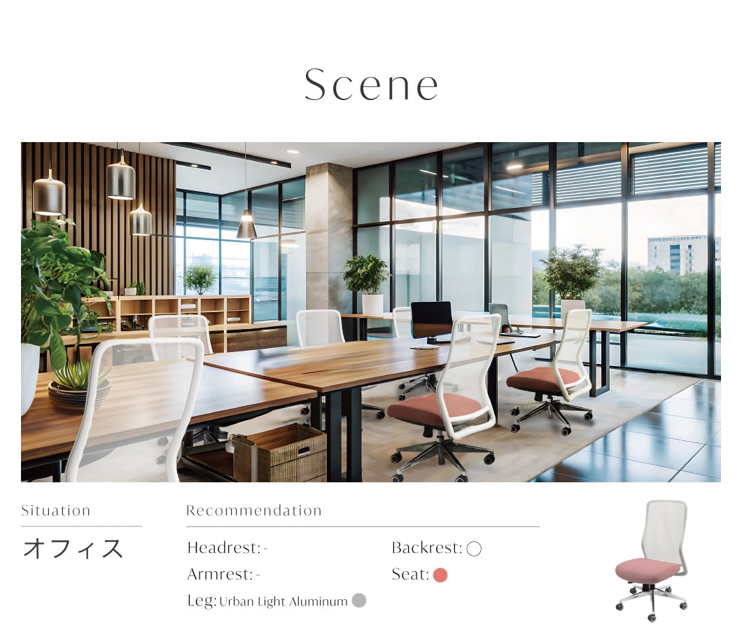 | 透過性の高い素材を採用した、未来的な美しさと快適性を両立した次世代チェア。 背面に用いた『Air-Fiメッシュ』は、優れた通気性と視覚的な軽やかさを実現し、空間に圧迫感を与えません。 破れが広がりにくい特殊構造で、復元力に優れ、長期間の使用にも安心。 計算された美しい形状は、長時間の作業時も快適な姿勢をサポートします。 全60通りから選べるセミオーダー仕様で、使用シーンや好みに応じた一脚を実現。 国内組立による高品質な製品です。 |
