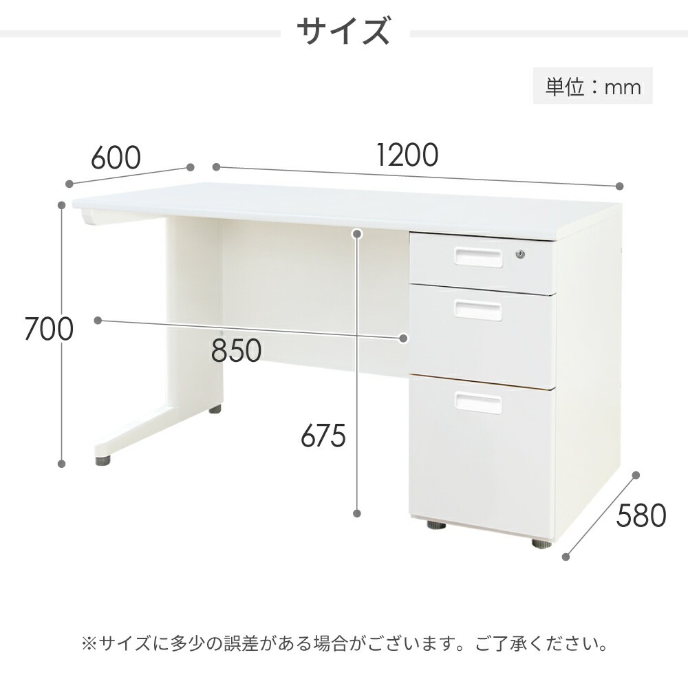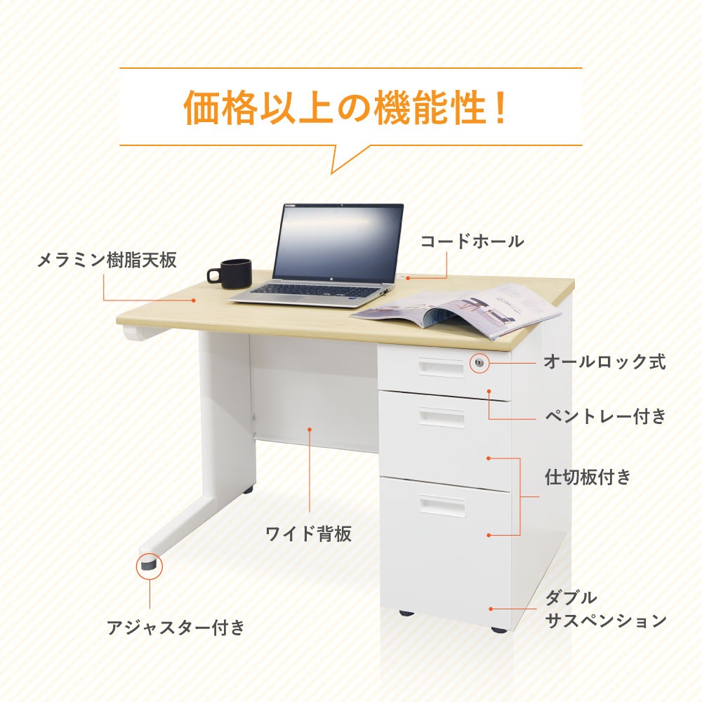■デスク 天板:パーティクルボード、メラミン化粧板 脚フレーム・幕板・袖箱:スチール、粉体塗装 耐荷重:天板/100kg、上段/5kg、中段/10kg、下段/25kg ■チェア フレーム:スチール 脚:ナイロン樹脂 座面:ウレタンフォーム、ポリエステル、合板 ●ガスシリンダー式昇降機能 |