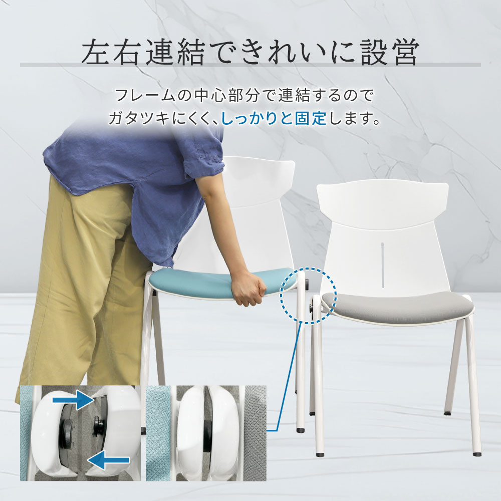 ■テーブル 【天板】 表面:合成樹脂化粧板(メラミンエンボス加工) 芯材:MDF+ハニカムコア エッジ:PVC 配線ボックス:アルミニウム 均等耐荷重:60kg 【脚】 角スチールパイプ(粉体塗装) ●アジャスター付き ●配線ボックス付き ■チェア 背・座:ポリプロピレン樹脂 張地:ポリエステル 脚:スチール(粉体塗装) アジャスター:ナイロン クッション材:ウレタンフォーム 耐荷重:80kg ●スタッキング(20台まで可) ●左右連結可能 |