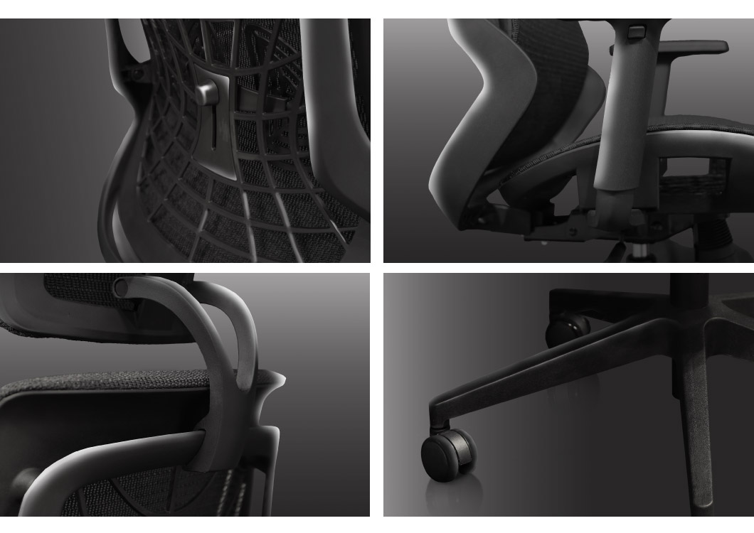 フレーム:ナイロン 肘:ナイロン、ポリウレタン ヘッドレスト:ナイロン 脚部:ナイロン キャスター:ポリウレタン 張地:メッシュ(エラストマー) ●シンクロロッキング ●座面スライド ●可動式アームレスト ●可動式ランバーサポート |