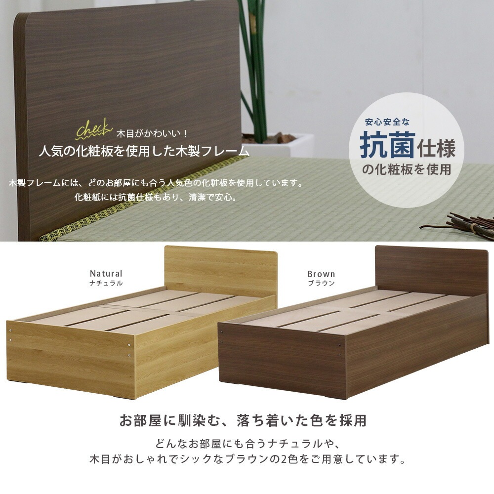 | すっきりとしたパネル型の畳ベッドです。 ボックスタイプなので、ほこりやゴミの侵入を防ぎます。 通常のマットレス床板よりも分厚く、頑丈な畳用床板を使用しており、安心してお使いいただけます。 人気の化粧板を使用した木製フレームで、スタイリッシュさと耐久性を兼ね備えています。 化粧板は抗菌仕様で、安心してお使いいただけます。 天然い草畳の上品で心地よい香りが、リラックスした睡眠をサポートします。 安心の日本製フレームで、長く快適にお使いいただけます。 |