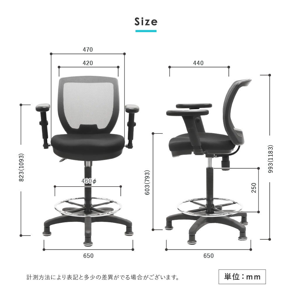 | サイズ | 外寸(キャスター脚時):幅650×奥行650×高さ1000~1190(座面高610~800)mm 外寸(固定脚時):幅650×奥行650×高さ993~1183(座面高603~793)mm 重量:13.6kg 梱包外寸:幅600×奥行590×高さ305mm 梱包重量:15.2kg |