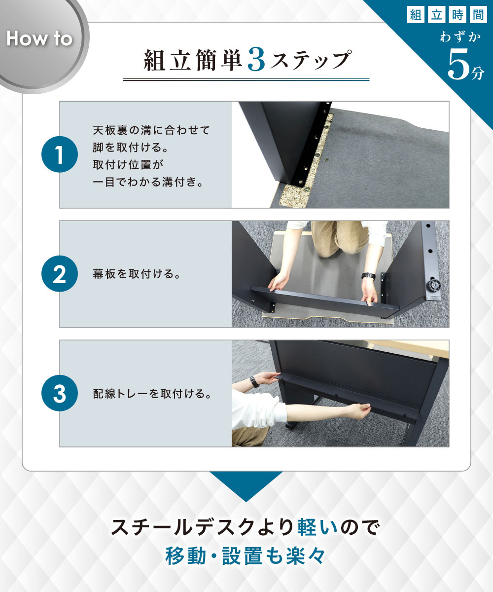 【脚】 パーチクルボード・スチール(粉体塗装) 【天板】 表面:合成樹脂化粧板(メラミンエンボス加工) 芯材:パーチクルボード エッジ:PVC アジャスター:ABS 耐荷重:天板/126kg ●アジャスター付き ●配線トレー付き |