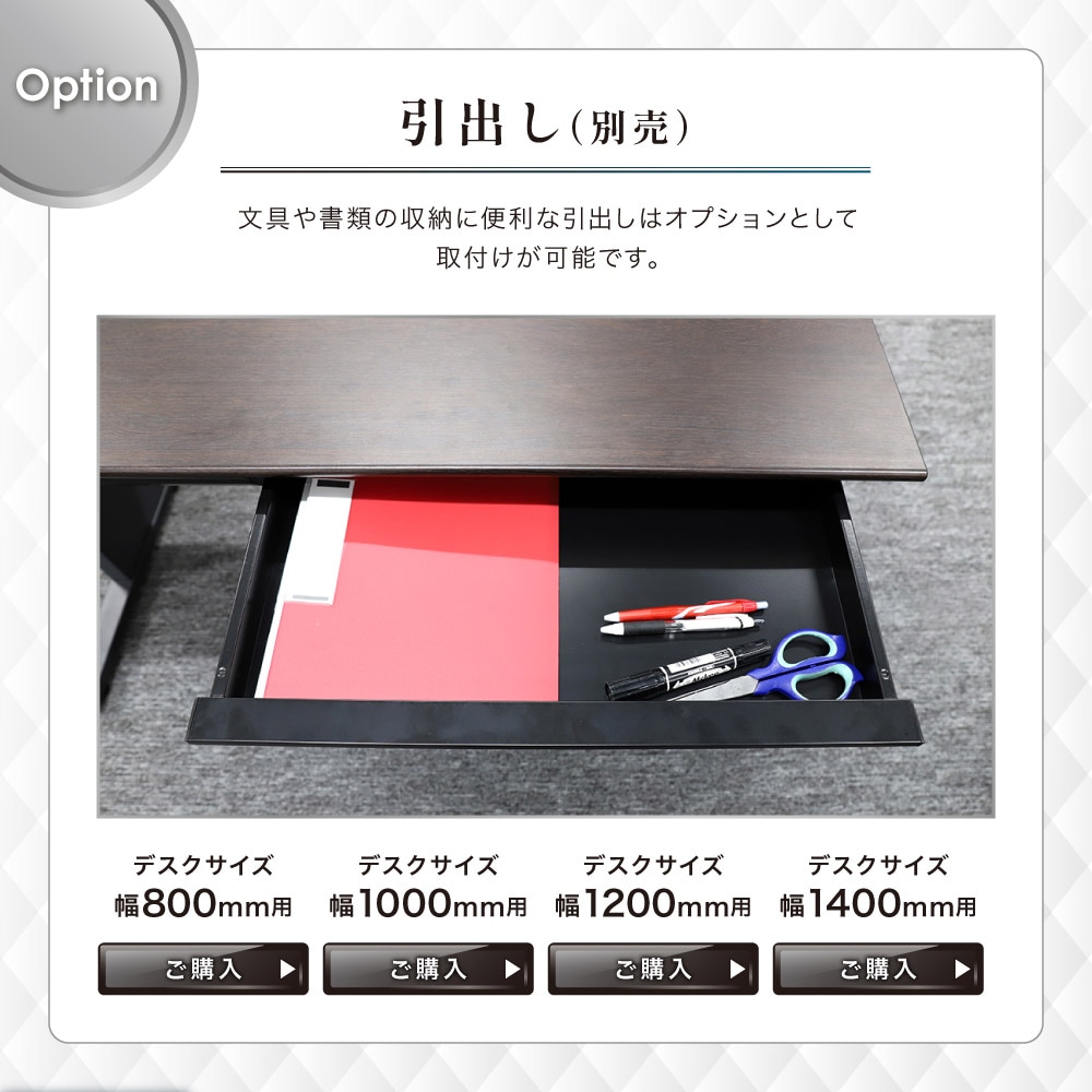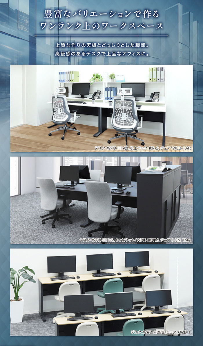 ワンランク上のワークスペースを作れるWorkProシリーズ。豊富なサイズとカラー展開のワークデスクです。 エッジは斜めにカットした上質な作りの天板と、どっしりとした脚部が高級感を演出。 天板までは720mmとゆったりした高さで、大き目の肘付チェアをしまったり、脚を組んだりする余裕があります。 オプションで引出しを付けて収納を増やすことも可能です。 天板中央にはコードを通せるスリット付き。また、配線トレーは幕板の内外どちらにも取付けられます。 用途に応じてフレキシブルに使える便利な平机です。 |